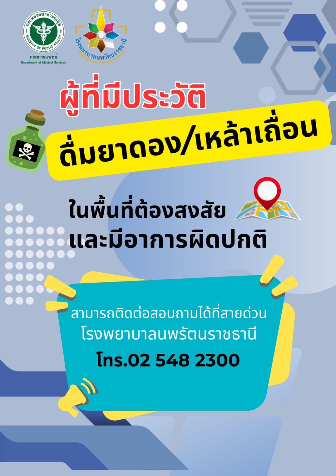 โรงพยาบาลนพรัตนราชธานี เปิดสายด่วนให้คำปรึกษาแก่ผู้ที่มีประวัติการดื่มยาดองหรือเหล้าเถื่อนในพื้นที่สงสัย