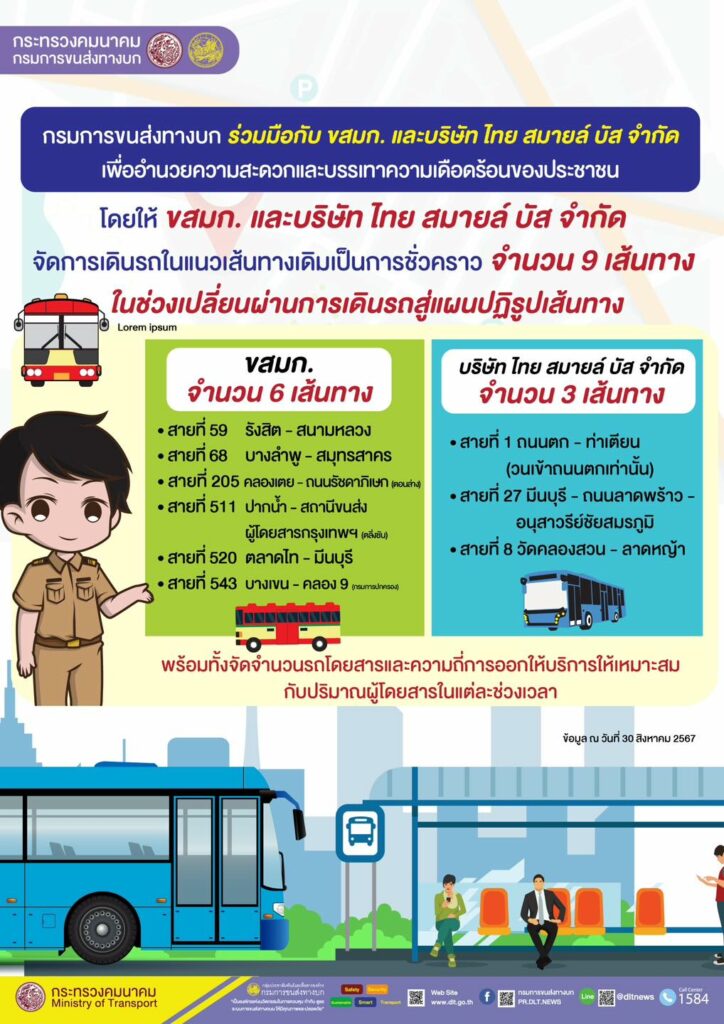 ตามที่มีข่าวในสื่อสังคมออนไลน์ (Facebook) ว่าองค์การขนส่งมวลชนกรุงเทพ (ขสมก.) จะหยุดเดินรถ ให้บริการในเส้นทางเดิม ในวันที่ 31 สิงหาคม 2567 และปรับการเดินรถจากเส้นทางเดิม เข้าสู่แนวเส้นทางปฏิรูปรถโดยสารประจำทางหมวด 1 ในเขตกรุงเทพมหานครและจังหวัดที่มีเส้นทางต่อเนื่องทำให้เกิดกระแสวิพากษ์วิจารณ์ และมีประชาชนผู้ใช้บริการ รถโดยสารประจำทางได้แสดงความวิตกกังวล ถึงผลกระทบที่อาจเกิดขึ้น ดังนั้น กรมการขนส่งทางบกจึงเชิญผู้บริหารจาก ขสมก. และบริษัท ไทย สมายล์ บัส จำกัด เข้าร่วมประชุมหารือแนวทางการลดผลกระทบจากการปรับเปลี่ยนเส้นทางเดินรถโดยสารประจำทางจากแนวเส้นทางเดิมสู่แนวทางการปฏิรูปเส้นทาง ซึ่งจากการหารือพบว่า มีเส้นทางปฏิรูปบางเส้นทาง เปลี่ยนแนวการเดินรถจากเส้นทางเดิม ทำให้ผู้ใช้บริการบางรายไม่ได้รับความสะดวกในการเดินทาง ขสมก. และ บริษัท ไทย สมายล์ บัส จำกัด จึงขอจัดการเดินรถในเส้นทางเดิมบางเส้นทางควบคู่กับการเดินรถแนวเส้นทางปฏิรูปฯ เพื่ออำนวยความสะดวกประชาชนที่ได้รับผลกระทบจากการเปลี่ยนผ่านการเดินรถสู่แผนปฏิรูปฯ โดยกรมการขนส่งทางบกอนุญาตให้ ขสมก. และ บริษัท ไทย สมายล์ บัส จำกัด เดินรถในแนวเส้นทางเดิมเป็นการชั่วคราว 9 เส้นทาง