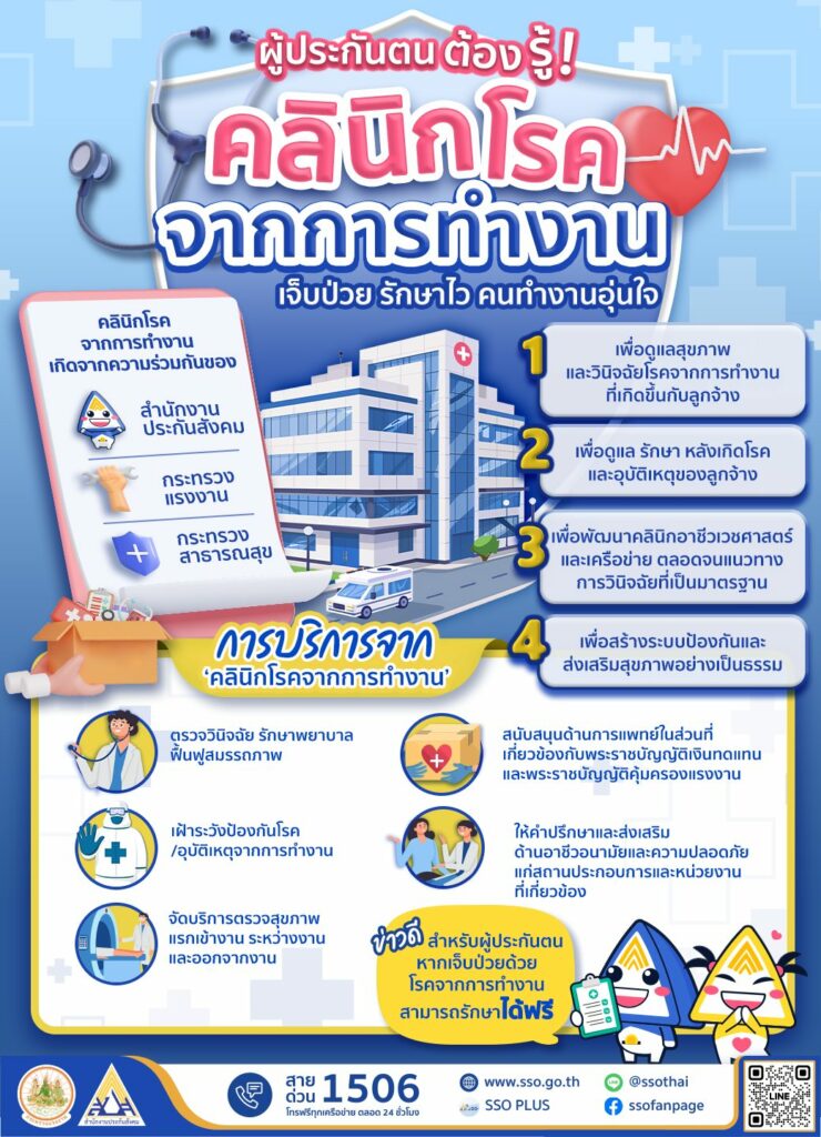 สำนักงานประกันสังคม แนะนำ หากเจ็บป่วยจากการทำงาน สามารถเข้ารักษาได้ที่ “คลินิกโรคจากการทำงาน” หากเจ็บป่วยด้วยโรคจากการทำงานก็สามารถรักษาได้ฟรี!