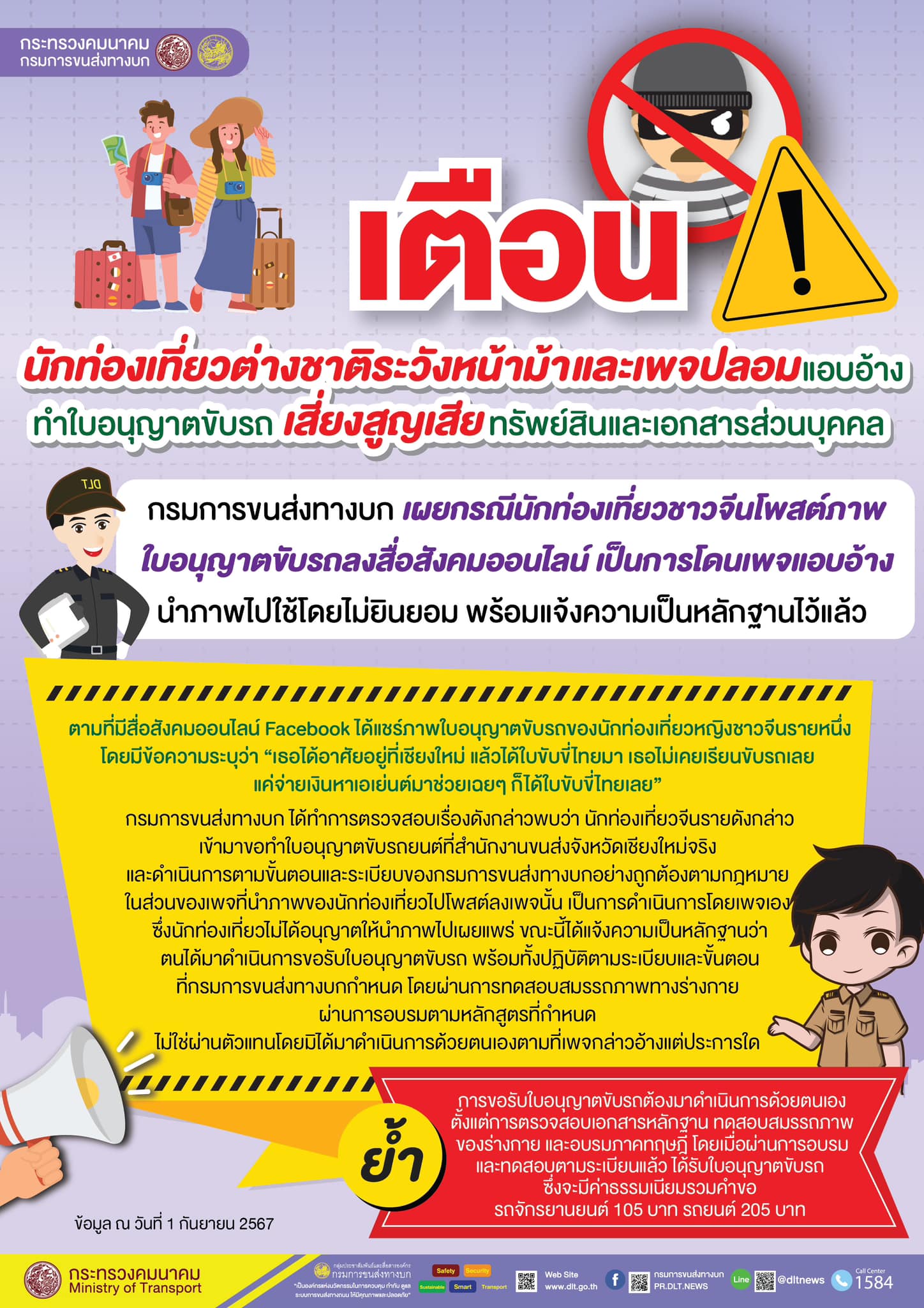 กรมการขนส่งทางบก เตือนนักท่องเที่ยวต่างชาติระวังหน้าม้าและเพจปลอมแอบอ้างทำใบอนุญาตขับรถ เสี่ยงสูญเสียทรัพย์สินและเอกสารส่วนบุคคล และโฆษณาหลอกลวงว่าสามารถออกใบขับขี่หรือต่ออายุใบขับขี่ โดยไม่ต้องเดินทางไปที่สำนักงานขนส่งและมีการเรียกเก็บเงินแพงกว่าค่าธรรมเนียม หากต้องการออกใบอนุญาตขับรถต้องมาดำเนินการด้วยตนเองที่สำนักงานขนส่งเท่านั้น