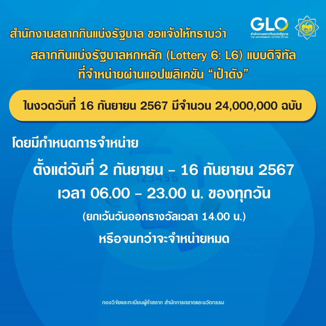 สำนักงานสลากกินแบ่งรัฐบาล ขอแจ้งให้ทราบว่า สลากกินแบ่งรัฐบาลหกหลัก (L6) ที่จำหน่ายผ่านแอปพลิเคชัน “เป๋าตัง” ในงวดวันที่ 16 กันยายน 2567 มีจำนวน 24,000,000 ฉบับ โดยมีกำหนดจำหน่าย ตั้งแต่วันที่ 2 กันยายน – 16 กันยายน 2567 ตั้งแต่เวลา 06.00 – 23.00 น. ของทุกวัน ยกเว้นวันออกรางวัลเวลา 14.00 น. หรือจนกว่าจะจำหน่ายหมด