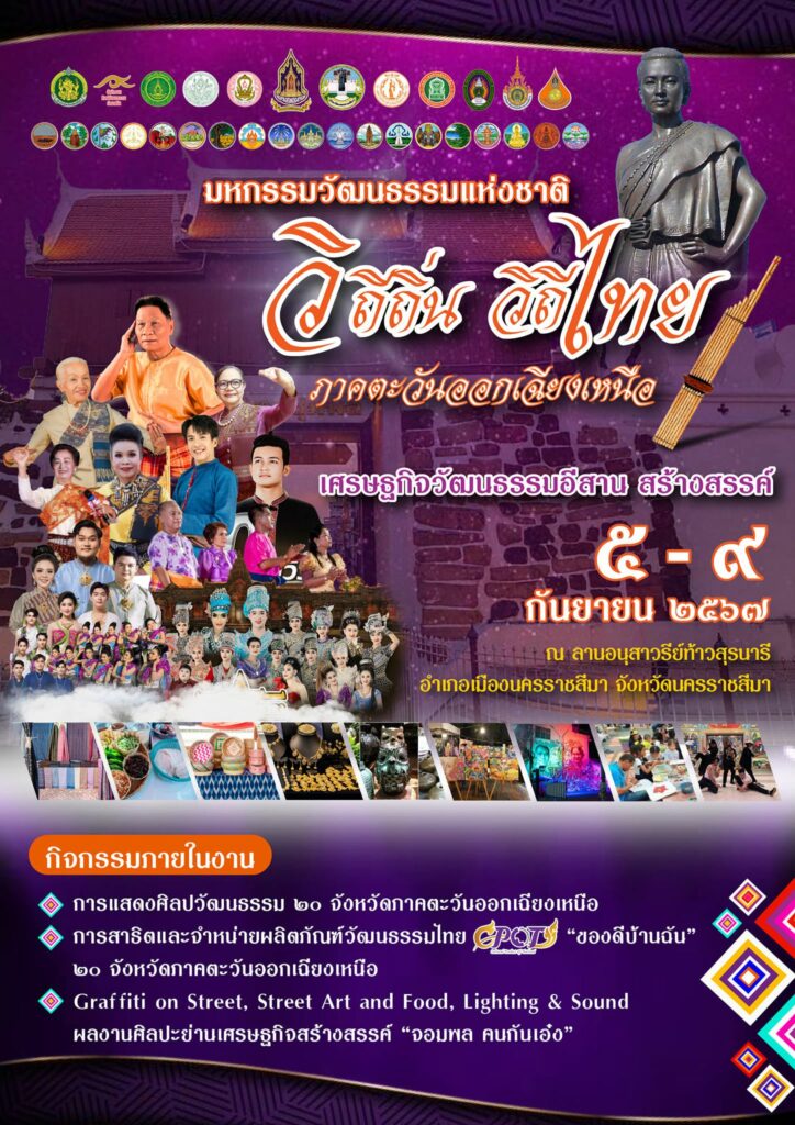 กระทรวงวัฒนธรรม เชิญเที่ยวงานมหกรรมวัฒนธรรมแห่งชาติ “วิถีถิ่น วิถีไทย” ภาคตะวันนออกเฉียงเหนือ “เศรษฐกิจวัฒนธรรมอีสาน สร้างสรรค์” วันที่ 5 – 9 กันยายน 2567 ณ ลานอนุสาวรีย์ท้าวสุรนารี อำเภอเมืองนคราราชสีมา จังหวัดนครราชสีมา