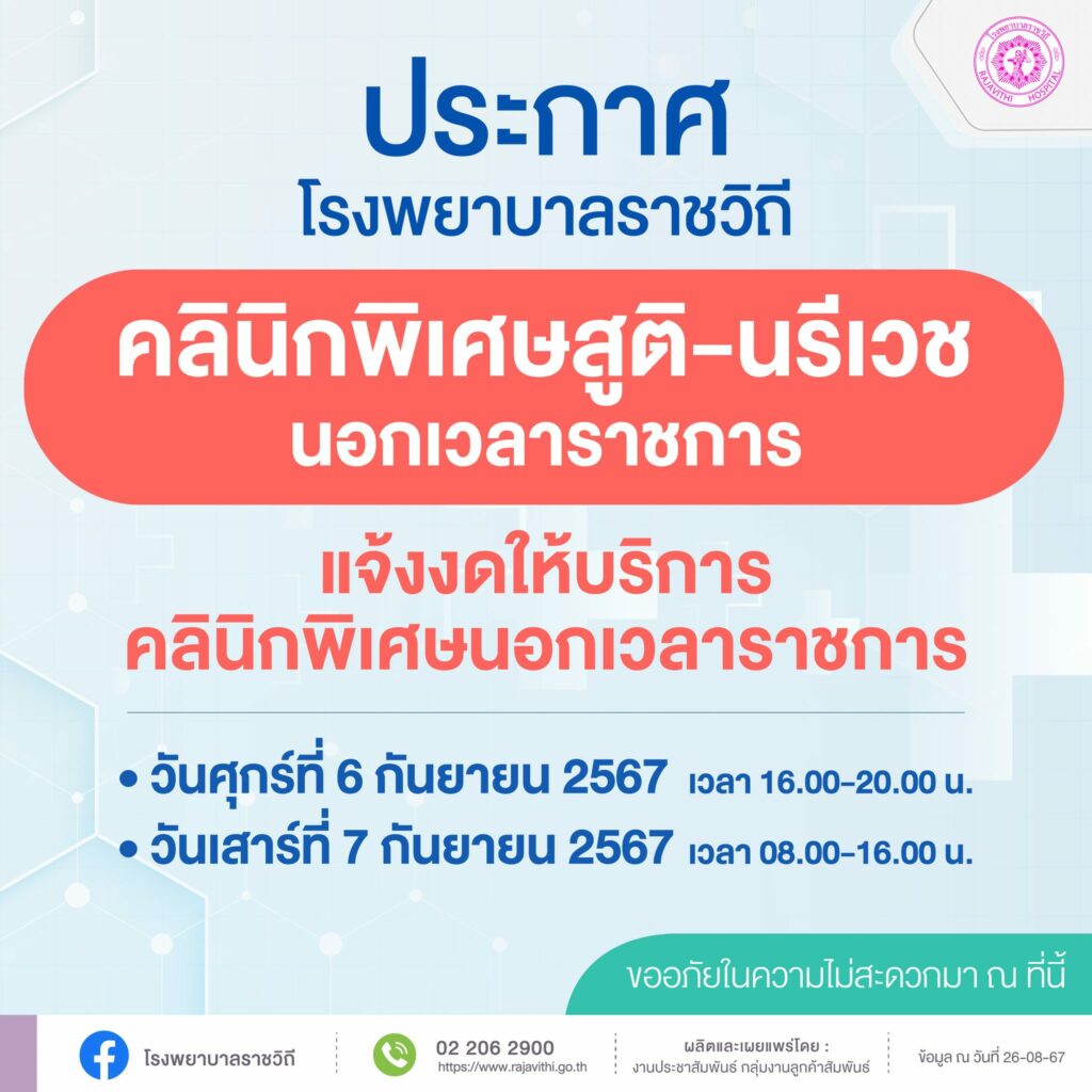 โรงพยาบาลราชวิถี กรมการแพทย์ แจ้ง “คลินิกพิเศษสูติ-นรีเวช นอกเวลาราชการ” งดให้บริการคลินิกพิเศษนอกเวลาราชการ วันศุกร์ที่ 6 กันยายน 2567 เวลา 16.00 – 20.00 น. และ วันเสาร์ที่ 7 กันยายน 2567 เวลา 08.00 – 16.00 น.