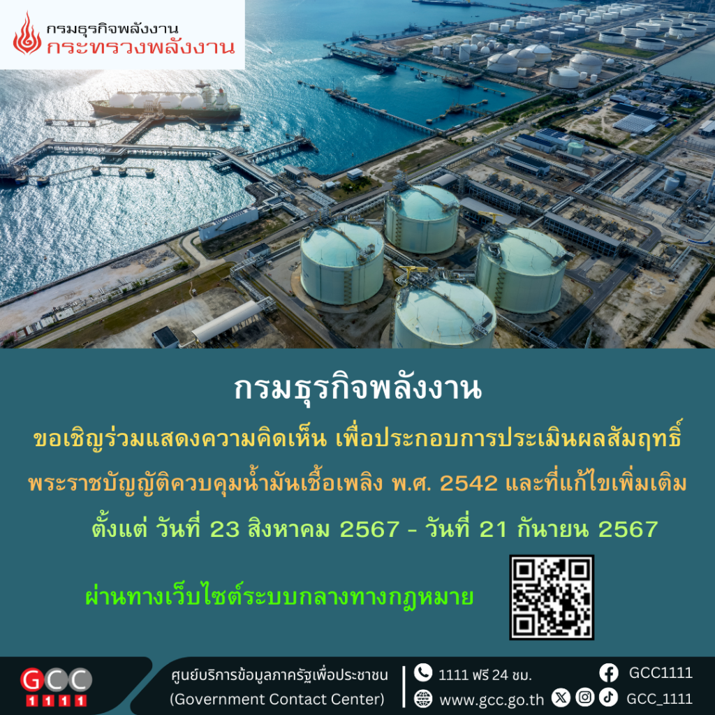 กรมธุรกิจพลังงาน เชิญร่วมแสดงความคิดเห็น พระราชบัญญัติควบคุมน้ำมันเชื้อเพลิง พ.ศ. 2542 และที่แก้ไขเพิ่มเติม