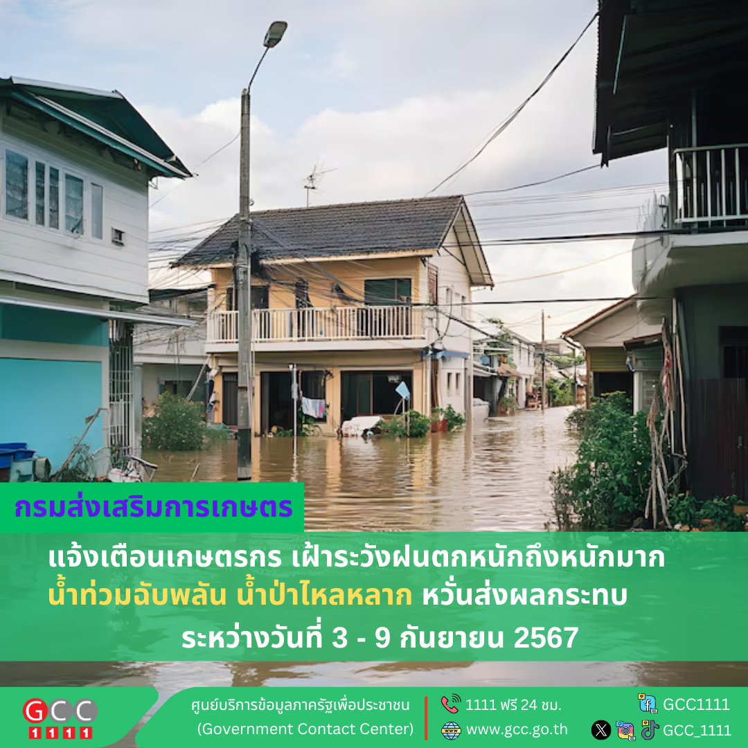 กรมส่งเสริมการเกษตร แจ้งเตือนเกษตรกร เฝ้าระวังฝนตกหนักถึงหนักมาก น้ำท่วมฉับพลัน น้ำป่าไหลหลาก ระหว่างวันที่ 3 – 9 กันยายน 2567 โดยขอให้เกษตรกรเฝ้าระวัง น้ำท่วมฉับพลัน น้ำป่าไหลหลาก และดินโคลนถล่ม โดยเฉพาะพื้นที่ลาดเชิงเขา ใกล้ทางน้ำไหลผ่านและพื้นที่ลุ่มต่ำรวมทั้งเฝ้าระวังระดับน้ำที่อาจเพิ่มขึ้นอย่างฉับพลันและระดับน้ำล้นตลิ่ง โดยเฉพาะบริเวณแม่น้ำสายหลัก ลําน้ำสาขา ระวังอันตรายและความเสียหายที่จะเกิดต่อผลผลิตทางการเกษตร และติดตามพยากรณ์อากาศอย่างต่อเนื่อง ทั้งนี้ เกษตรกรผู้ประสบภัยแจ้งความเสียหาย ได้ที่ ศูนย์บริการเกษตรพิรุณราช ณ สํานักงานเกษตรอําเภอ และเจ้าหน้าที่ของกรมส่งเสริมการเกษตรใกล้บ้านท่านทุกอําเภอ