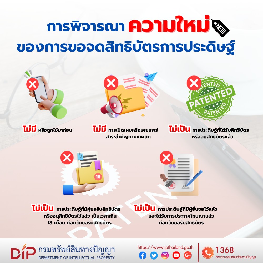 กรมทรัพย์สินทางปัญญา แนะนำความรู้เกี่ยวกับ สิทธิบัตรและอนุสิทธิบัตร โดยการจดทะเบียนคำขอรับสิทธิบัตรหรืออนุสิทธิบัตร มีเงื่อนไขสำคัญอย่างหนึ่งคือ การประดิษฐ์ที่จะได้รับจดทะเบียนต้องเป็น “การประดิษฐ์ขึ้นใหม่” (พ.ร.บ. สิทธิบัตร พ.ศ. 2522 มาตรา 5)
