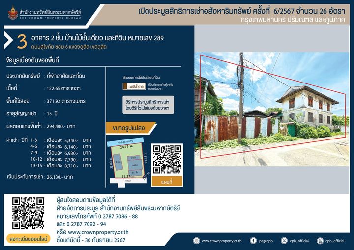 สำนักงานทรัพย์สินพระมหากษัตริย์ เปิดประมูลสิทธิการเช่าอสังหาริมทรัพย์ ครั้งที่ 6/2567 เขตดุสิต