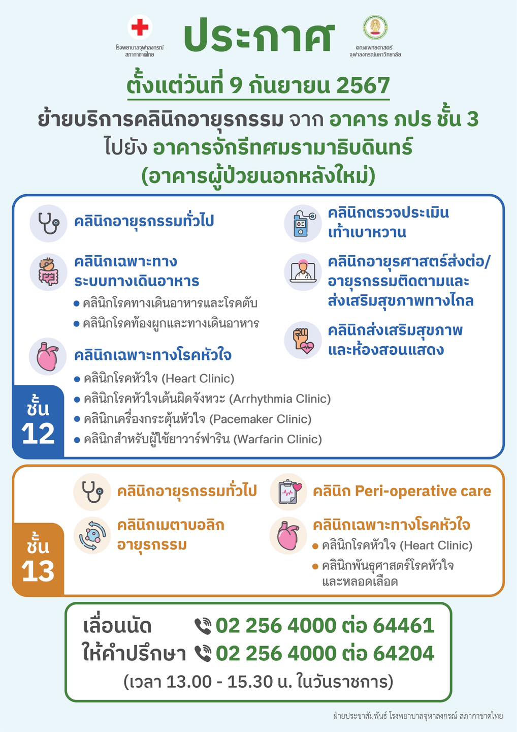 โรงพยาบาลจุฬาลงกรณ์ สภากาชาดไทย แจ้งย้ายบริการ คลินิกอายุรกรรม จากอาคาร ภปร ชั้น 3 ไปยัง อาคารจักรีทศมรามาธิบดินทร์ (อาคารผู้ป่วยนอกหลังใหม่) ชั้น 12 และ 13 ตั้งแต่บัดนี้เป็นต้นไป
