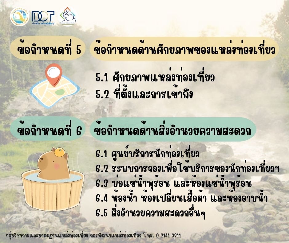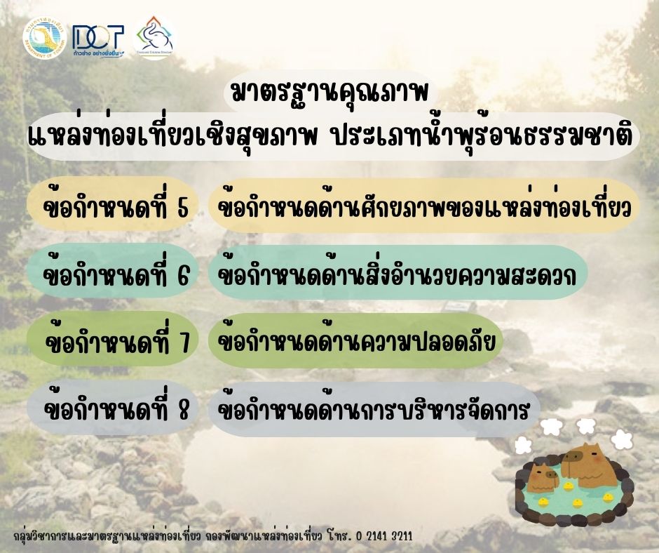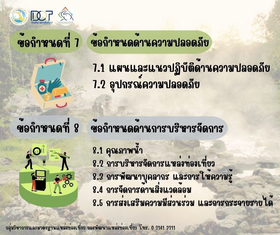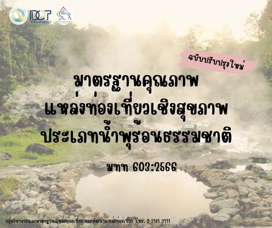 กรมการท่องเที่ยว ได้ทำการปรับปรุงมาตรฐานแหล่งท่องเที่ยวเชิงสุขภาพ ประเภทน้ำพุร้อนธรรมชาติ ฉบับปรับปรุง พ.ศ. 2566 เพื่อให้สอดคล้องกับสถานการณ์ด้านการท่องเที่ยวในปัจจุบัน ภายใต้ระบบการตรวจประเมินและรับรองมาตรฐานที่เป็นที่ยอมรับในระดับสากล มาตรฐานฉบับนี้ได้ให้ความสำคัญในประเด็นด้านศักยภาพของแหล่งท่องเที่ยว สิ่งอำนวยความสะดวก ความปลอดภัย และการบริหารจัดการ ซึ่งประกอบด้วย 9 ข้อกำหนด 14 เกณฑ์การประเมิน และ 81 ตัวชี้วัด นอกจากนี้ยังได้ระบุถึงเกณฑ์สำหรับการพิจารณาคะแนนในการตรวจประเมินของแต่ละดัชนีชี้วัดรวมถึงระดับของการรับรองมาตรฐานฯ เพื่อเป็นประโยชน์ต่อผู้ตรวจประเมินและผู้ที่นำมาตรฐานฉบับนี้ไปประยุกต์ใช้