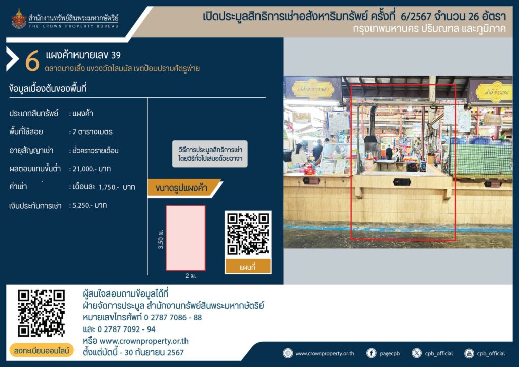 สำนักงานทรัพย์สินพระมหากษัตริย์ เปิดประมูลสิทธิการเช่าอสังหาริมทรัพย์ ครั้งที่ 6/2567 เขตป้อมปราบศัตรูพ่าย กรุงเทพฯ จำนวน 1 อัตรา