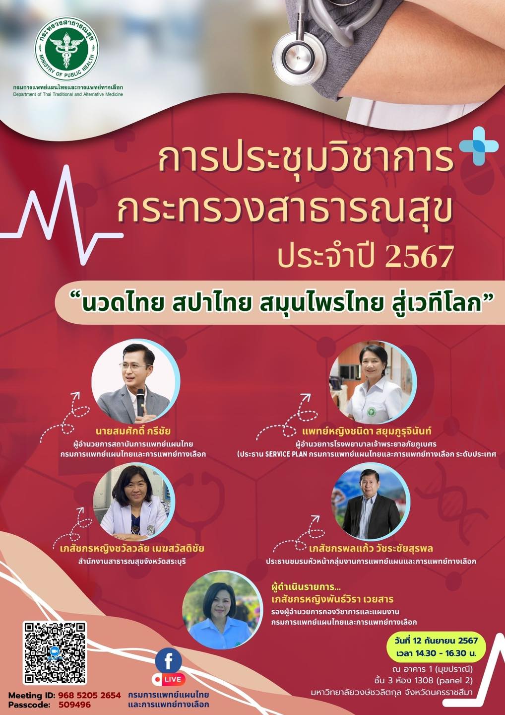 การประชุมวิชาการกระทรวงสาธารณสุข ประจำปี 2567 หัวข้อ “นวดไทย สปาไทย สมุนไพรไทย สู่เวทีโลก“