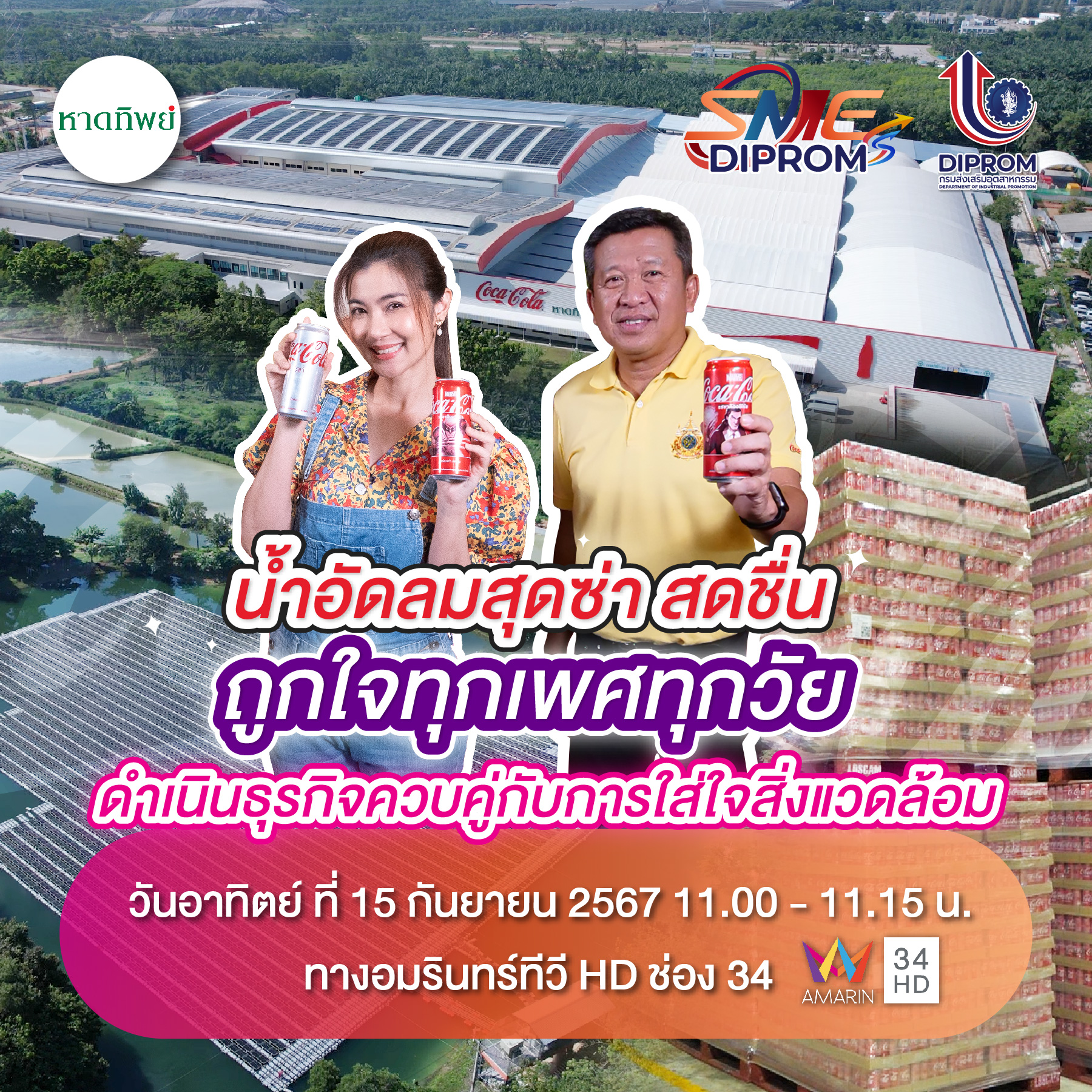 กรมส่งเสริมอุตสาหกรรม จัดรายการ SMEs DIPROM ในหัวข้อ น้ำอัดลมสุดซ่า สดชื่น ถูกใจทุกเพศทุกวัย ดำเนินธุรกิจควบคู่กับการใส่ใจสิ่งแวดล้อม วันที่ 15 กันยายน 2567 เวลา 11.00 – 11.15 น. ทางอมรินทร์ทีวี HD ช่อง 34
