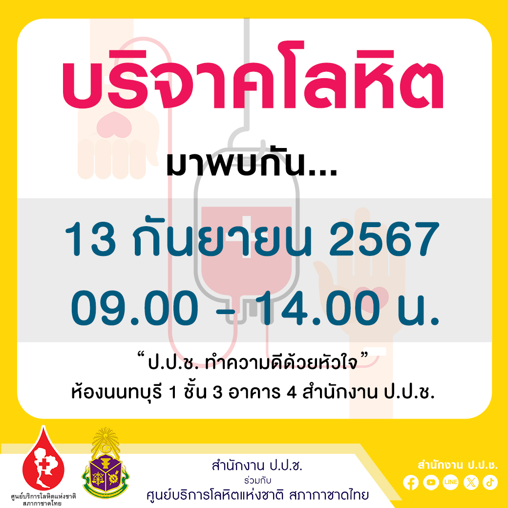 สำนักงาน ป.ป.ช. ขอเชิญชวนร่วมบริจาคโลหิตถวายเป็นพระราชกุศล ในวันที่ 13 กันยายน 2567