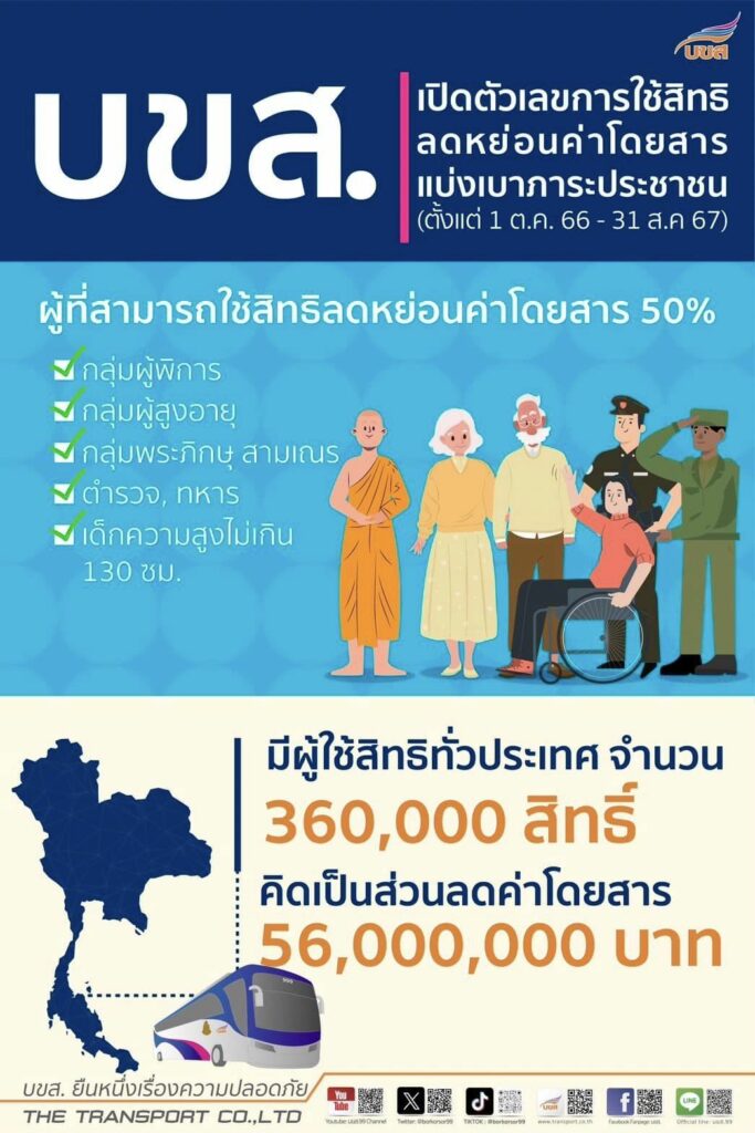 นายอรรถวิท รักจำรูญ กรรมการฯ รักษาการแทนกรรมการผู้จัดการใหญ่ บริษัท ขนส่ง จำกัด (บขส.) เปิดเผยว่า ตามที่กระทรวงคมนาคม มีนโยบายคมนาคม เพื่อความอุดมสุขของประชาชน โดยต้องการให้คนไทย อยู่ดี กินดี เข้าถึงบริการระบบขนส่งสาธารณะที่สะดวก ปลอดภัย และราคาเป็นธรรม บขส. ในฐานะหน่วยงานรัฐวิสาหกิจ สังกัดกระทรวงคมนาคม ที่ได้ดำเนินงานด้านความรับผิดชอบของสังคม (CSR) อย่างต่อเนื่อง รวมทั้งต้องการดูแลประชาชนให้ได้รับสิทธิ์อันพึงมีอย่างทั่วถึง จึงให้สิทธิลดหย่อนค่าโดยสารกับกลุ่มผู้โดยสาร เช่น กลุ่มผู้พิการ ได้รับสิทธิลดหย่อน 50%, กลุ่มผู้สูงอายุ สิทธิลดหย่อน 50% และ กลุ่มพระภิกษุ สามเณร สิทธิลดหย่อน 50% เป็นต้น ซึ่งเป็นไปตามเงื่อนไขที่กรมการขนส่งทางบก (ขบ.) กำหนด เพื่อช่วยแบ่งเบาภาระค่าใช้จ่ายในการเดินทางและเป็นการตอบแทนสังคม โดยสิทธิลดหย่อนค่าโดยสารดังกล่าว ผู้โดยสารที่ได้รับสิทธิจะได้ส่วนลดค่าโดยสาร (ไม่รวมค่าธรรมเนียม) โดยสามารถใช้สิทธิได้ที่หน้าช่องจำหน่ายตั๋วโดยสารของ บขส. ทั่วประเทศเท่านั้น