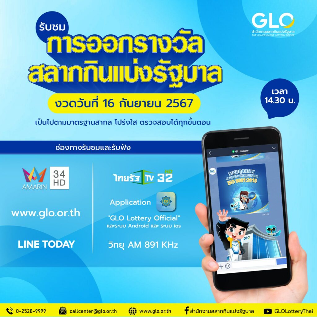 สำนักงานสลากกินแบ่งรัฐบาล ออกรางวัลสลากกินแบ่งรัฐบาล งวดวันที่ 16 กันยายน 2567 ณ สำนักงานสลากกินแบ่งรัฐบาล ถนนนนทบุรี อำเภอเมืองนนทบุรี จังหวัดนนทบุรี การออกรางวัลเป็นไปตามมาตรฐานสากล ISO 9001 : 2015 โปร่งใส ตรวจสอบได้ทุกขั้นตอน