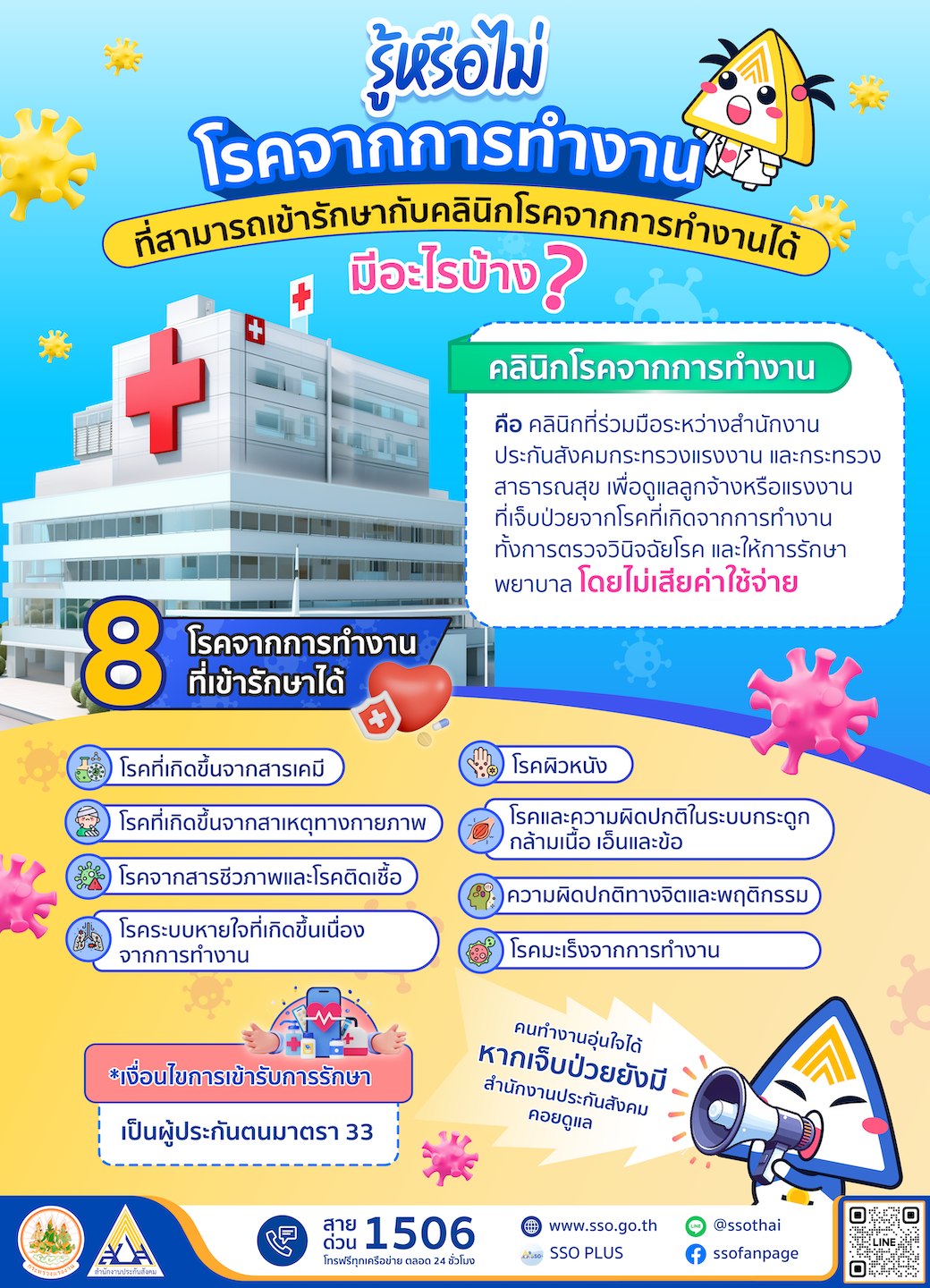 สำนักงานประกันสังคม แนะนำ 8 โรคจากการทำงานที่สามารถเข้ารักษากับคลินิกโรคจากการทำงานได้ เพื่อดูแลลูกจ้างหรือแรงงานที่เจ็บป่วยจากโรคที่เกิดจากการทำงาน โดยไม่เสียค่าใช้จ่าย ซึ่งเงื่อนไขในการเข้ารับการรักษา ต้องเป็นผู้ประกันตนมาตรา 33