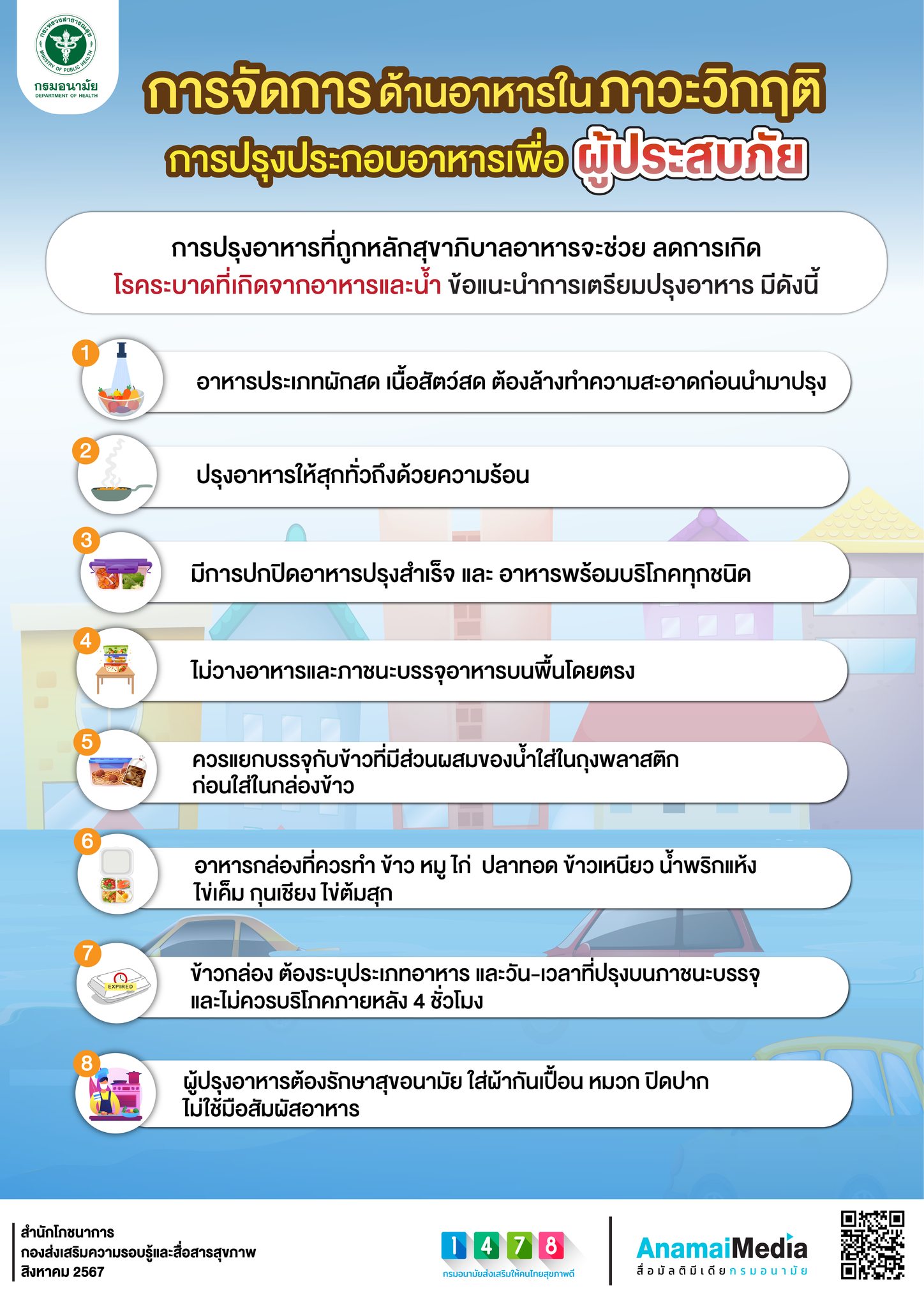 กรมอนามัย แนะการจัดการด้านอาหารในภาวะวิกฤติการปรุงประกอบอาหาร เพื่อผู้ประสบภัย โดยมีข้อแนะนำการเตรียมปรุงอาหาร ดังนี้
