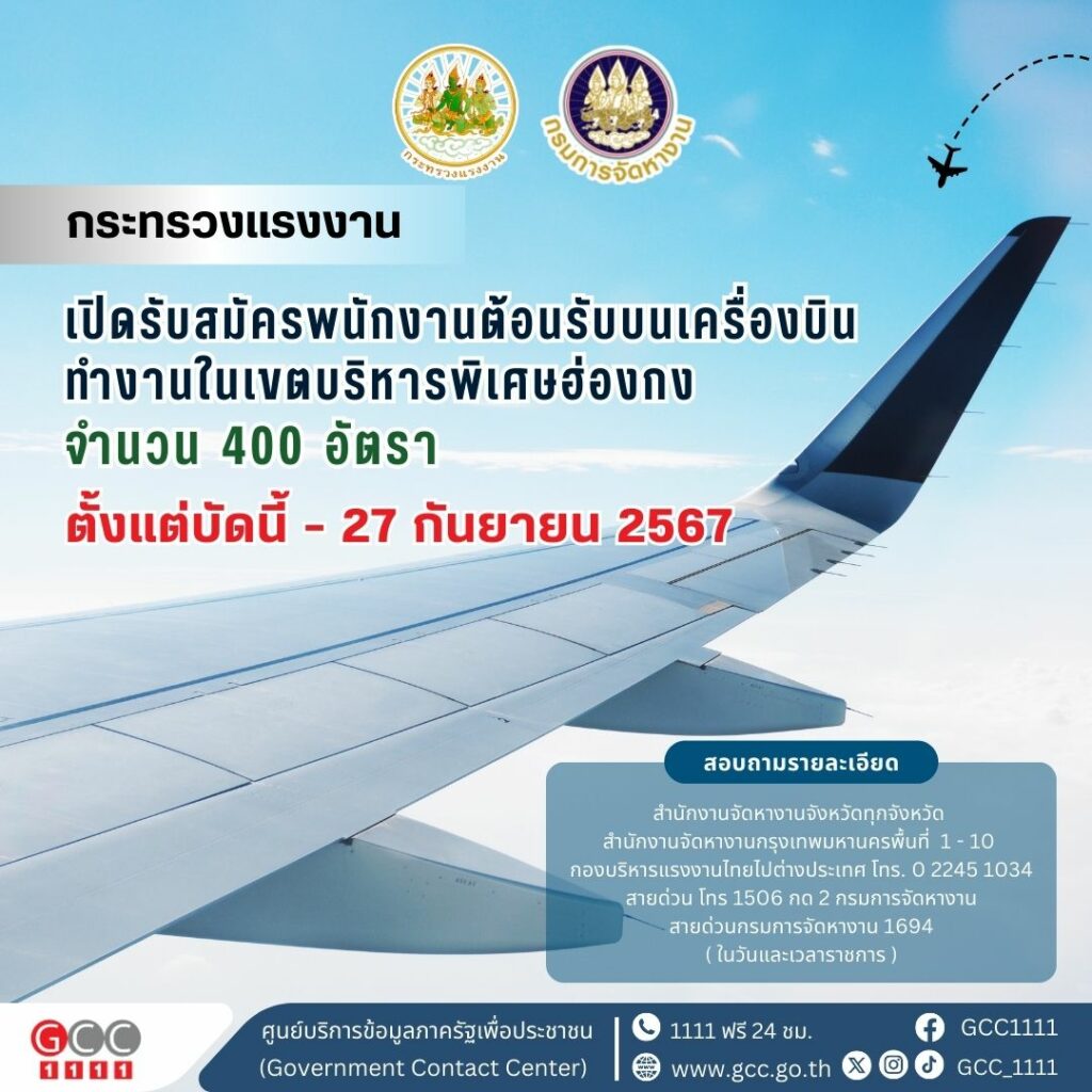 กรมการจัดหางาน เปิดรับสมัครคนไทยทำงานบนเครื่องบินฮ่องกง 400 อัตรา ตั้งแต่บัดนี้ – 27 กันยายน 2567