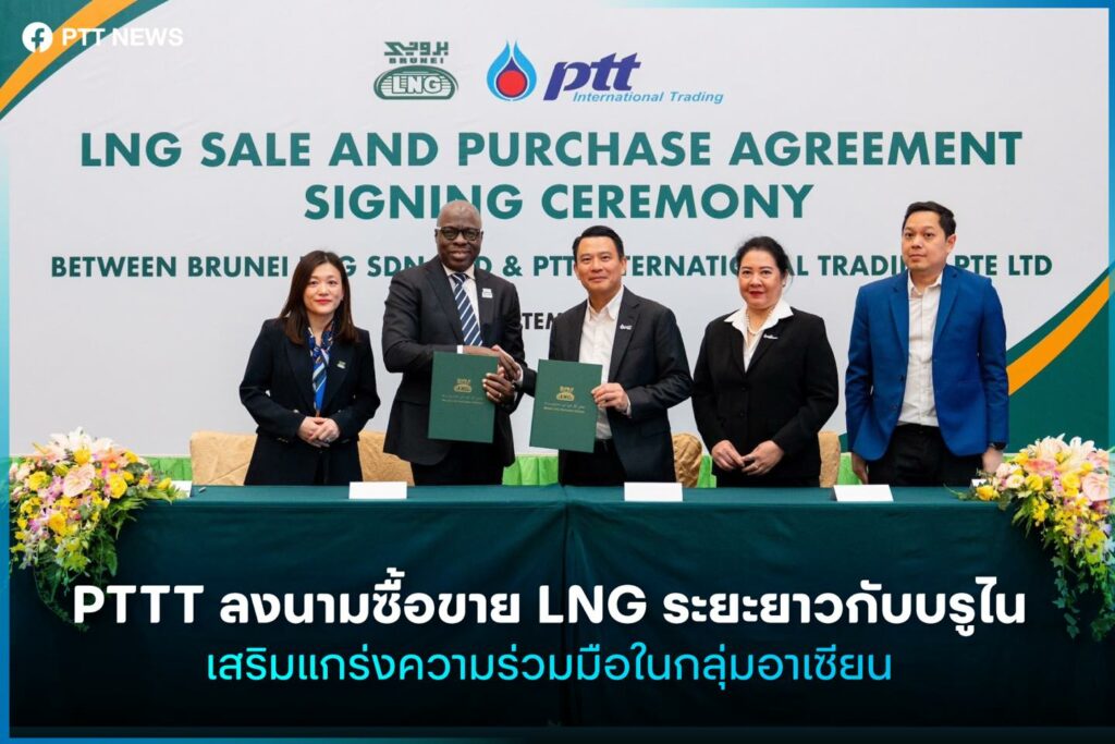 บริษัท ปตท. ค้าสากล จำกัด (PTTT) ลงนามสัญญาซื้อขายก๊าซธรรมชาติเหลว (LNG) ระยะยาวร่วมกับ Brunei LNG Sendirian Berhad (BLNG) เป็นครั้งแรก โดยมี นายพงษ์พันธุ์ อมรวิวัฒน์ รองกรรมการผู้จัดการใหญ่หน่วยธุรกิจการค้าระหว่างประเทศ บริษัท ปตท. จำกัด (มหาชน) (ปตท.) (กลาง) เป็นประธานในพิธี พร้อมด้วย นางธนันต์พร ตั้งพิทักษ์กุล กรรมการผู้จัดการ บริษัท ปตท. ค้าสากล จำกัด (ที่ 2 จากขวา) Mr. Gbolahan Adeleye Falade, Managing Director / Chief Executive Officer, BLNG (ที่ 2 จากซ้าย) ร่วมลงนาม ทั้งนี้ การลงนามสัญญาดังกล่าว มีระยะเวลาของสัญญาตั้งแต่ พ.ศ. 2568 – 2572 เพื่อเพิ่มขีดความสามารถในการแข่งขัน และเสริมศักยภาพด้านการค้าระหว่างประเทศของ ปตท. เพื่อสร้างความมั่นคงทางพลังงานให้แก่ประเทศ มุ่งสู่การเป็นศูนย์กลางซื้อขาย LNG ในภูมิภาคอาเซียน ตลอดจนเป็นการต่อยอดความร่วมมือภายในภูมิภาค สอดรับกับพันธกิจของ ปตท. ที่มุ่งสู่การเติบโตขององค์กรในระดับโลกอย่างยั่งยืน