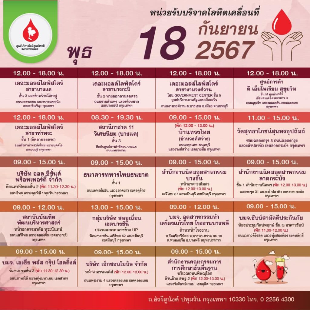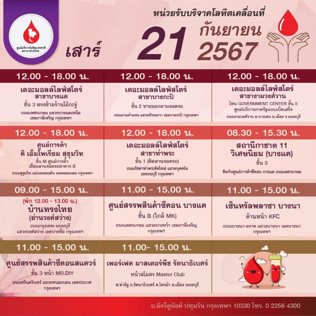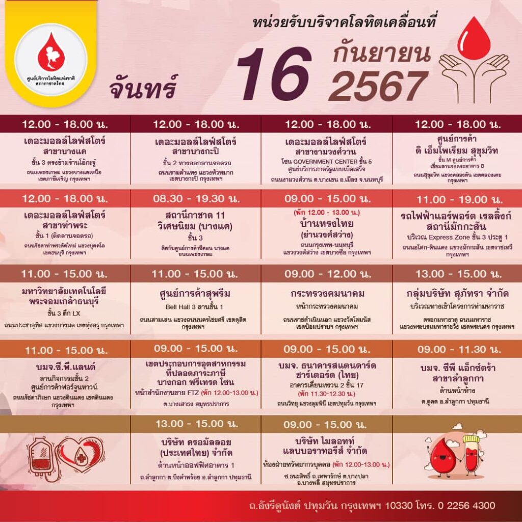 สภากาชาดไทย ออกหน่วยรับบริจาคโลหิตเคลื่อนที่ วันที่ 16 – 22 กันยายน 2567