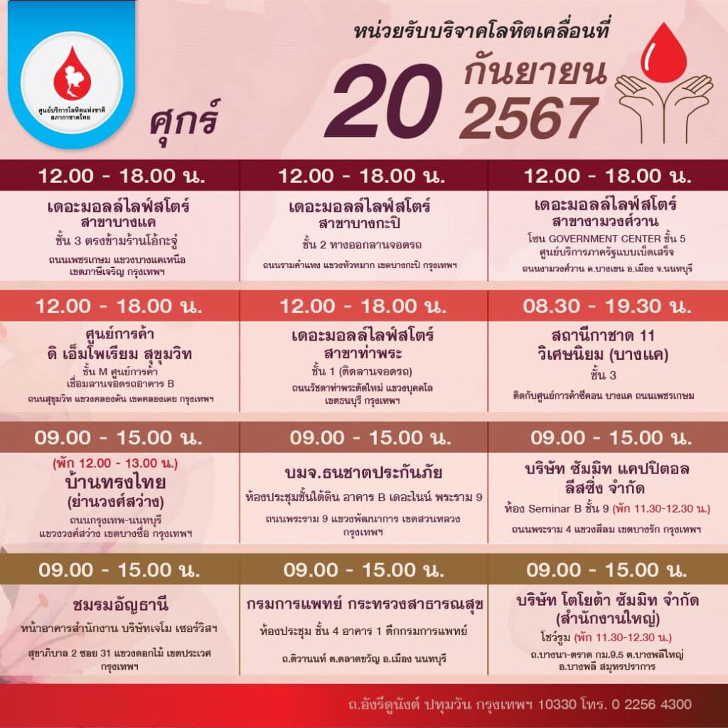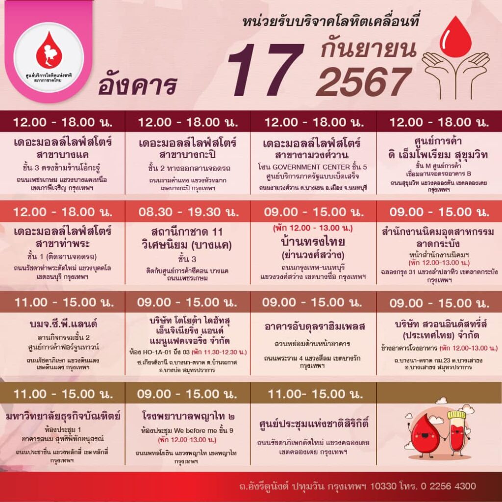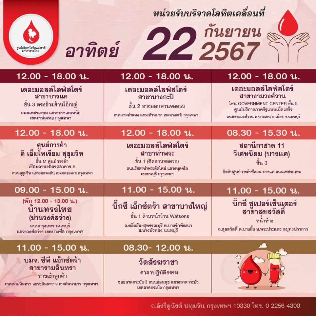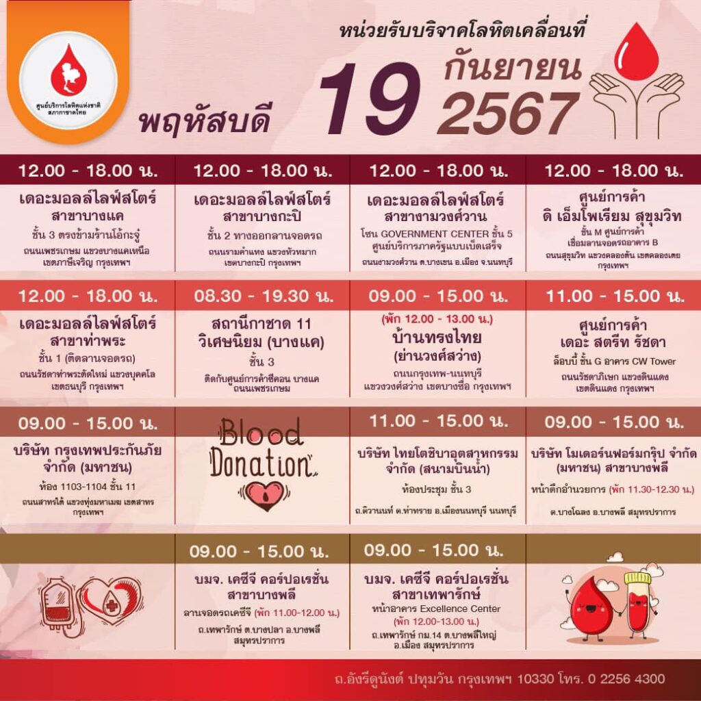 สภากาชาดไทย ออกหน่วยรับบริจาคโลหิตเคลื่อนที่ วันที่ 16 – 22 กันยายน 2567