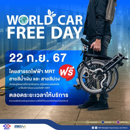 - รฟม. และ BEM ร่วมรณรงค์ลดภาวะโลกร้อนใน กิจกรรม “World Car Free Day 2024” เพื่อช่วยลดปัญหาการจราจร ลดการใช้น้ำมัน ลดมลพิษทางเสียง ลดฝุ่นละออง PM 2.5