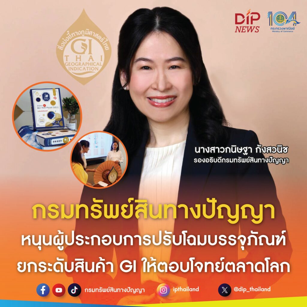 นางสาวกนิษฐา กังสวนิช รองอธิบดีกรมทรัพย์สินทางปัญญา เปิดเผยว่า “สิ่งบ่งชี้ทางภูมิศาสตร์ หรือ GI เป็นหนึ่งในความคุ้มครองทรัพย์สินทางปัญญาที่ให้กับสินค้าชุมชนที่มีคุณภาพและมีชื่อเสียง ซึ่งมีความเป็นเอกลักษณ์เฉพาะตัว อันเกิดจากสภาพภูมิประเทศ ภูมิอากาศ และภูมิปัญญาของท้องถิ่น นอกจากนี้ GI ยังเป็นเครื่องมือในการสร้างมูลค่าเพิ่มให้กับสินค้าท้องถิ่น โดยสามารถสร้างรายได้เข้าสู่ประเทศกว่า 73,000ล้านบาท/ปี กรมทรัพย์สินทางปัญญาจึงมุ่งมั่นส่งเสริมสินค้า GI เชิงรุกในทุกมิติ ทั้งด้านการขึ้นทะเบียน GI การควบคุมคุณภาพสินค้าการส่งเสริมการตลาดและสร้างมูลค่าเพิ่มให้กับสินค้า GI เพื่อยกระดับคุณภาพชีวิตความเป็นอยู่ให้กับพี่น้องเกษตรกรผู้ผลิตและผู้ประกอบการ GI และขับเคลื่อนภาพรวมเศรษฐกิจของประเทศให้เติบโตอย่างยั่งยืน”
