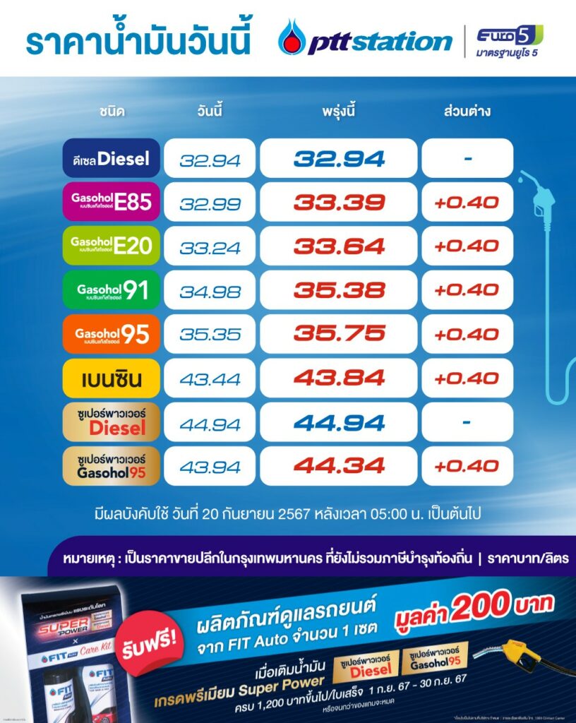ปตท. ปรับขึ้นราคาน้ำมันในกลุ่มเบนซินโดยน้ำมันในกลุ่มเบนซิน ปรับขึ้นราคา 0.40 บาท/ลิตร ส่วนน้ำมันในกลุ่มดีเซลราคาคงเดิม มีผลวันที่ 20 กันยายน 2567 ตั้งแต่เวลา 05.00 น. เป็นต้นไป