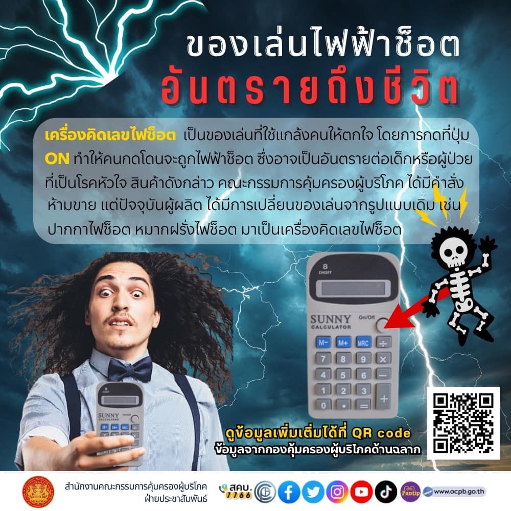 สำนักงานคณะกรรมการคุ้มครองผู้บริโภค แจ้งเตือนของเล่นไฟฟ้าช็อต อันตรายถึงชีวิต โดยเครื่องคิดเลขไฟช็อต เป็นของเล่นที่ใช้แกล้งคนให้ตกใจ โดยการกดที่ปุ่ม ON ทําให้คนกดโดนจะถูกไฟฟ้าช็อต ซึ่งอาจเป็นอันตรายต่อเด็กหรือผู้ป่วย ที่เป็นโรคหัวใจ สินค้าดังกล่าว คณะกรรมการคุ้มครองผู้บริโภค ได้มีคําสั่ง ห้ามขาย แต่ปัจจุบันผู้ผลิต ได้มีการเปลี่ยนของเล่นจากรูปแบบเดิม เช่น ปากกาไฟช็อต หมากฝรั่งไฟช็อต มาเป็นเครื่องคิดเลขไฟช็อต