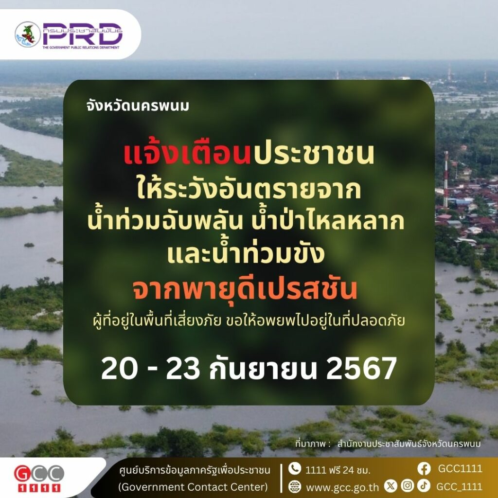 สำนักงานประชาสัมพันธ์จังหวัดนครพนม แจ้งเตือนประชาชนให้ระวังอันตรายจากน้ำท่วมฉับพลัน น้ำป่าไหลหลาก และน้ำท่วมขัง จากพายุดีเปรสชัน ในระหว่างวันที่ 20 – 23 กันยายน 2567 โดยขอให้ผู้ที่อยู่ในพื้นที่เสี่ยงภัยที่เป็นลุ่มต่ำใกล้ฝั่งแม่น้ำโขง รวมทั้งแม่น้ำลำน้ำสาขาต่าง ๆ ให้ขนย้ายสิ่งของขึ้นไว้บนที่สูง และขอให้อพยพคนและสัตว์เลี้ยงไปอยู่ในที่ปลอดภัยพร้อมทั้งตรวจสอบอาคารบ้านเรือน สิ่งปลูกสร้างต่าง ๆ ให้อยู่ในสภาพที่ความมั่นคงแข็งแรง ไม่จอดรถหรือหลบฝนใต้ต้นไม้ใหญ่ ให้ขับขี่ยานพาหนะด้วยความระมัดระวัง และขอให้เชื่อฟังคำสั่งของเจ้าหน้าที่โดยเฉพาะการให้อพยพไปอยู่ในที่ปลอดภัย หรือศูนย์พักพิงต่าง ๆ สำหรับจังหวัดนครพนมให้เฝ้าระวังสถานการณ์น้ำท่วมฉับพลัน น้ำป่าไหลหลาก และน้ำท่วมขัง