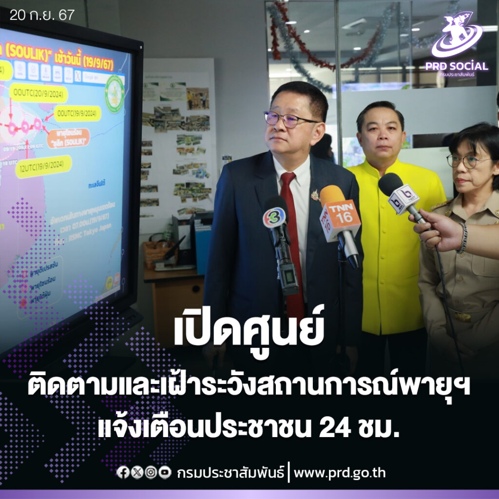 (19 ก.ย. 67) นายประเสริฐ จันทรรวงทอง รองนายกรัฐมนตรี และรัฐมนตรีว่าการกระทรวงดิจิทัลเพื่อเศรษฐกิจและสังคม (ดีอี) เป็นประธานเปิดศูนย์ติดตามและเฝ้าระวังสถานการณ์พายุดีเปรสชันของกรมอุตุนิยมวิทยา เพื่อติดตามและเฝ้าระวังพายุที่มีผลกระทบต่อประเทศไทย ตลอด 24 ชม. โดยประสานงานและประเมินสถานการณ์ข้อมูลจากส่วนกลางและ 5 ศูนย์อุตุนิยมวิทยาประจำภาคต่าง ๆ ร่วมกับหน่วยงานที่เกี่ยวข้องเพื่อเพิ่มความสามารถในการแจ้งเตือนประชาชนได้อย่างทันท่วงที ลดผลกระทบและความเสียหายจากพายุ อุทกภัย ที่อาจเกิดขึ้นกับประชาชน