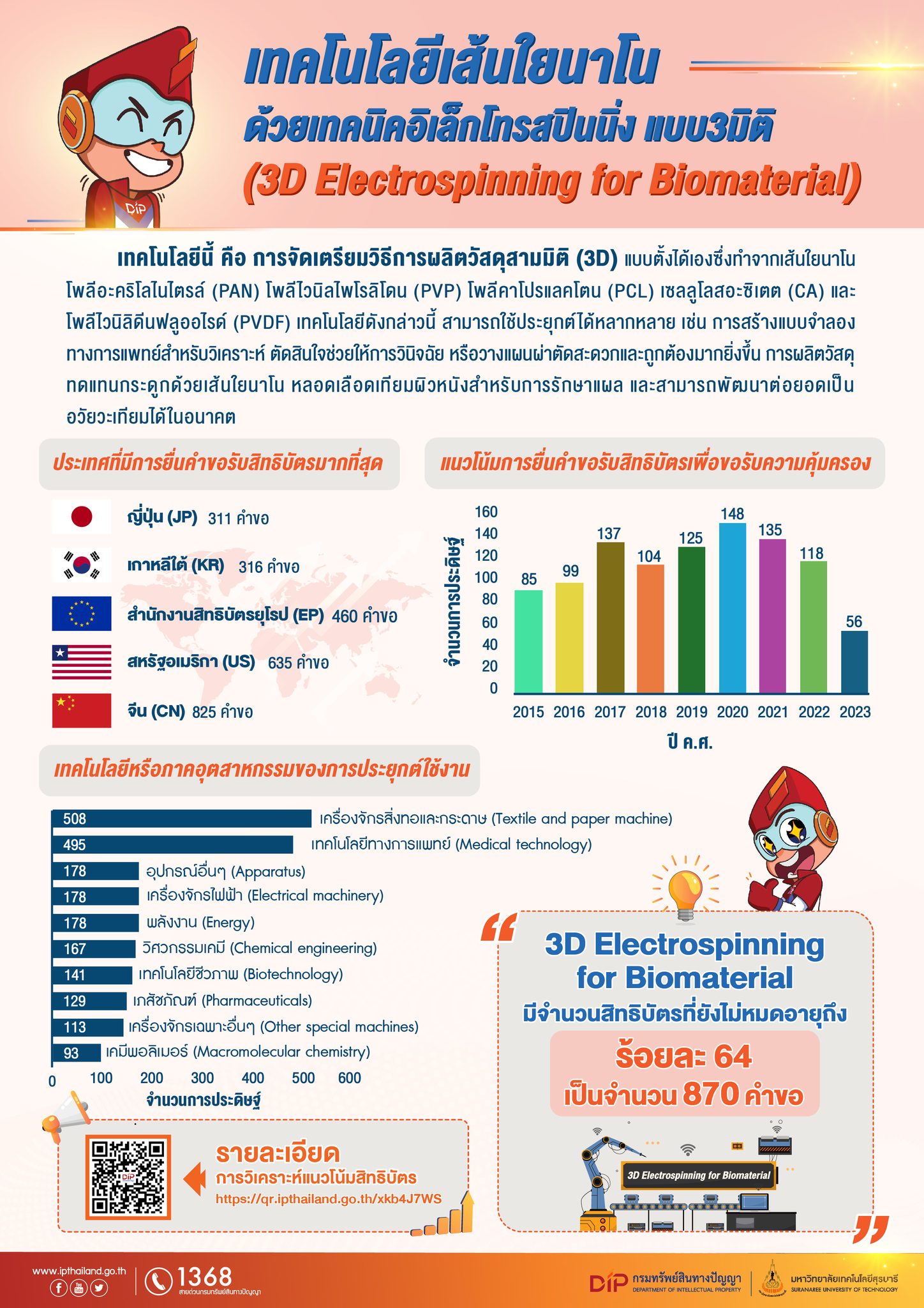 กรมทรัพย์สินทางปัญญา แนะนำแนวโน้มการยื่นขอรับความคุ้มครองเทคโนโลยีเส้นใยนาโน ด้วยเทคนิคอิเล็กโทรสปินนิ่งแบบ 3 มิติ (3D Electrospinning for Biomaterial) โดยสามารถใช้ประยุกต์ได้หลากหลาย เช่น การสร้างแบบจ่าลอง ทางการแพทย์สำหรับวิเคราะห์ตัดสินใจช่วยให้การวินิจฉัย หรือวางแผนผ่าตัดสะดวกและถูกต้องมากยิ่งขึ้น การผลิตวัสดุทดแทนกระดูกด้วยเส้นใยนาโน หลอดเลือดเทียมผิวหนังสำหรับการรักษาแผล และสามารถพัฒนาต่อยอดเป็น อวัยวะเทียมได้ในอนาคด ทั้งนี้ สามารถศึกษาเทคโนโลยีเส้นใยนาโนด้วยเทคนิคอิเล็กโทรสปินนิ่งแบบสามมิติฉบับเต็มได้ที่ https://shorturl.asia/gDf0T