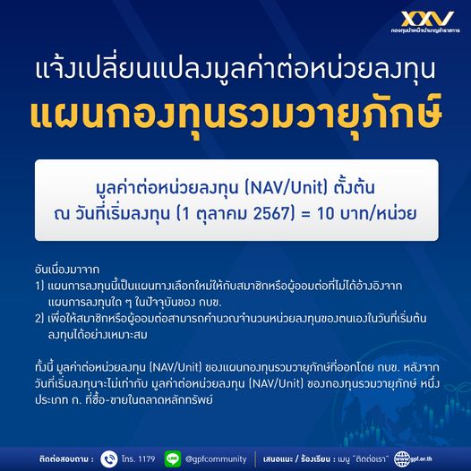 กองทุนบำเหน็จบำนาญข้าราชการ แจ้งเปลี่ยนแปลงมูลค่าต่อหน่วยลงทุน แผนกองทุนรวมวายุภักษ์