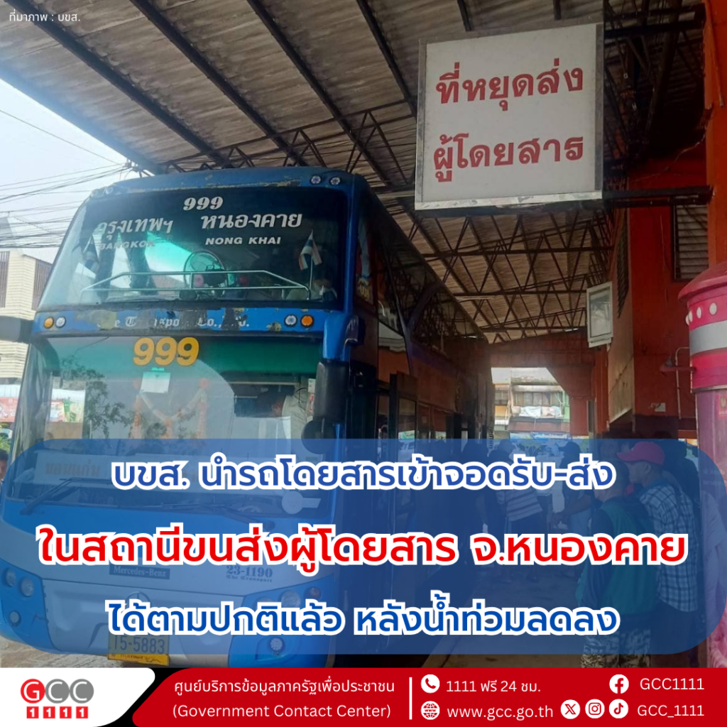 บริษัท ขนส่ง จำกัด (บขส.) นำรถโดยสารเข้าจอดรับ-ส่งในสถานีขนส่งผู้โดยสาร จ.หนองคาย ได้ตามปกติแล้ว หลังน้ำท่วมลดลง เพื่อให้บริการผู้โดยสารและประชาชนต่อไป