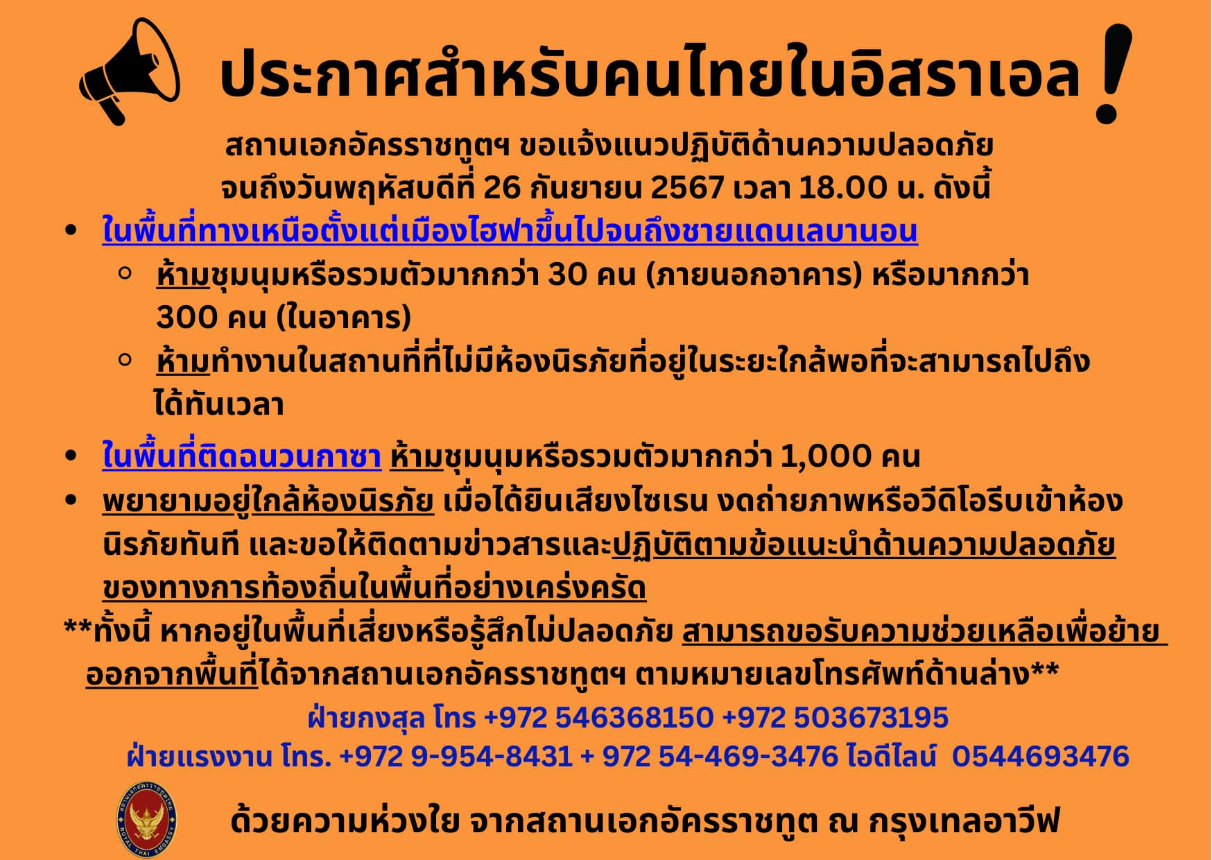ประกาศสําหรับคนไทยในอิสราเอล สถานเอกอัครราชทูตฯ ขอแจ้งแนวปฏิบัติด้านความปลอดภัย จนถึงวันพฤหัสบดีที่ 26 กันยายน 2567 เวลา 18.00 น. ดังนี้
