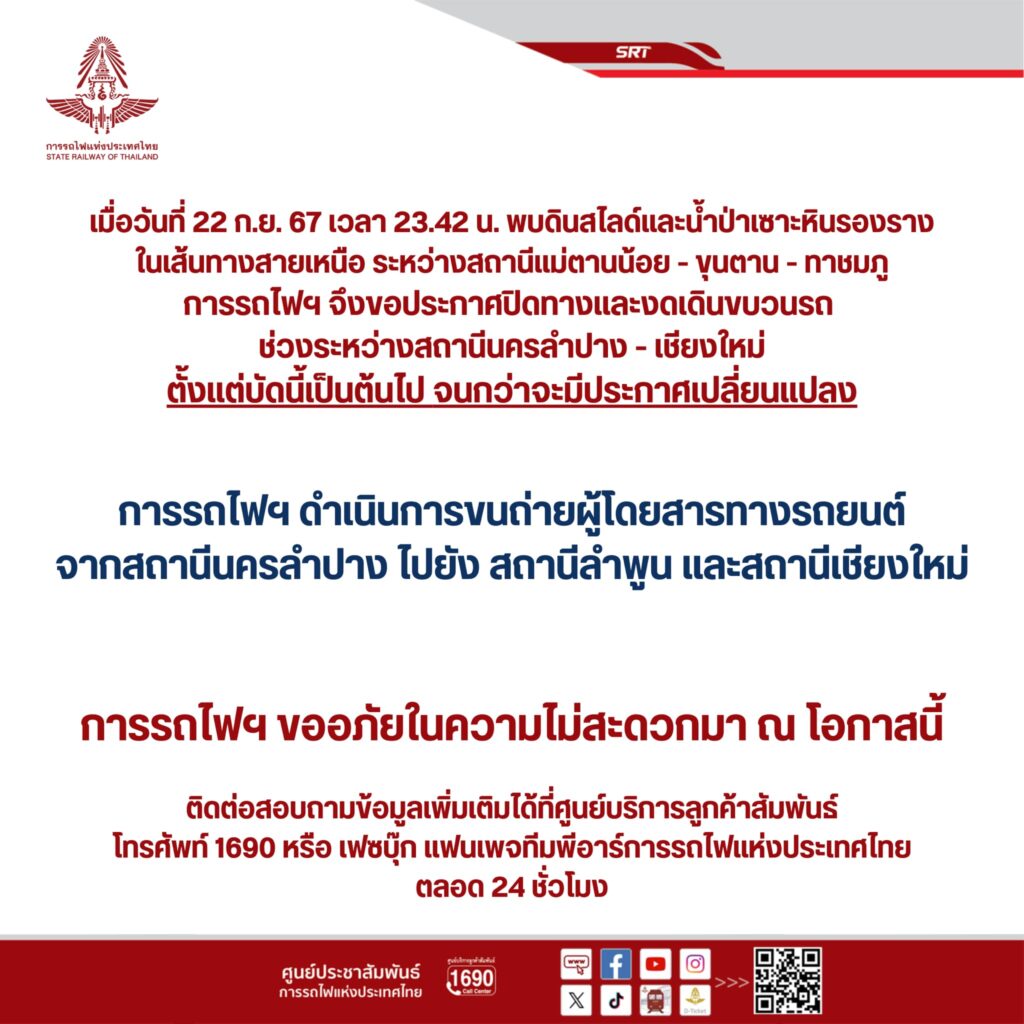 การรถไฟแห่งประเทศไทย ประกาศปิดทางและงดเดินขบวนรถ ช่วงระหว่างสถานีนครลำปาง – เชียงใหม่ ตั้งแต่บัดนี้เป็นต้นไป เนื่องด้วย เมื่อวันที่ 22 กันยายน 2567 เวลา 23.42 น. พบดินสไลด์และน้ำป้าเซาะหินรองราง ในเส้นทางสายเหนือ ระหว่างสถานีแม่ตานน้อย – ขุนตาน – ทาชมภู จึงขอประกาศปิดทางและงดเดินขบวนรถ ช่วงระหว่างสถานีนครลำปาง – เชียงใหม่ ตั้งแต่บัดนี้เป็นต้นไป จนกว่าจะมีประกาศเปลี่ยนแปลง สอบถามข้อมูลเพิ่มเติมได้ที่ ศูนย์บริการลูกค้าสัมพันธ์ โทร.1690 หรือ เฟซบุ๊ก แฟนเพจทีมพี่อาร์การรถไฟแห่งประเทศไทย ตลอด 24 ชั่วโมง