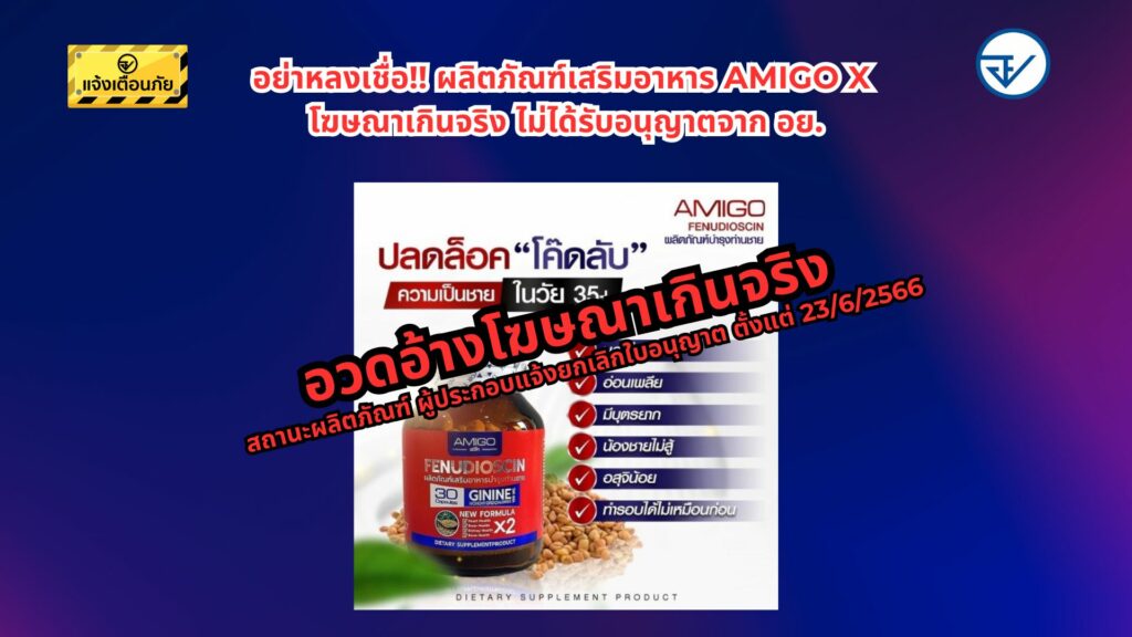 อย. ได้รับเรื่องร้องเรียนจากผู้บริโภคว่าพบการโฆษณาผลิตภัณฑ์เสริมอาหาร AMIGO X จากร้านค้าออนไลน์ ระบุสรรพคุณ “…นอนไม่หลับ…อ่อนเพลีย…มีบุตรยาก…น้องชายไม่สู้…อสุจิน้อย…AMIGO แก้ทุกปัญหาของ “ผู้ชาย” เพิ่มความต้องการ…เสริมความอึด ทน แข็งนาน…” และพบมีการแสดงเลขสารบบอาหาร 20-1-03563-5-0263 จากการตรวจสอบข้อเท็จจริง พบว่า สถานะผลิตภัณฑ์ ผู้ประกอบแจ้งยกเลิกใบอนุญาต ตั้งแต่ 23/6/2566 และมีการโฆษณาแสดงคุณประโยชน์ คุณภาพ หรือสรรพคุณของผลิตภัณฑ์อันเป็นเท็จหรือหลอกลวงให้เกิดความหลงเชื่อโดยไม่สมควร ไม่ได้รับอนุญาตโฆษณาจาก อย.