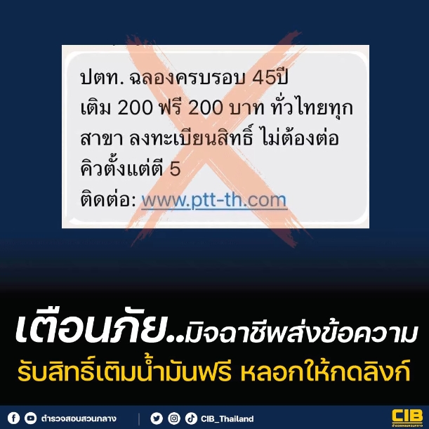 กองบัญชาการตำรวจสอบสวนกลาง แจ้งเตือนมิจฉาชีพปลอมข้อความอ้างว่า บริษัท ปตท. เปิดลงทะเบียนรับสิทธิ์เติมน้ำมัน 200 บาท ฟรี 200 บาท โดยให้กดรับสิทธิ์ผ่านเว็บไซต์ปลอม หากประชาชนหลงเชื่อกดลิงก์ดังกล่าวอาจถูกดูดข้อมูลส่วนบุคคล หรือสูญเงินในบัญชีได้
