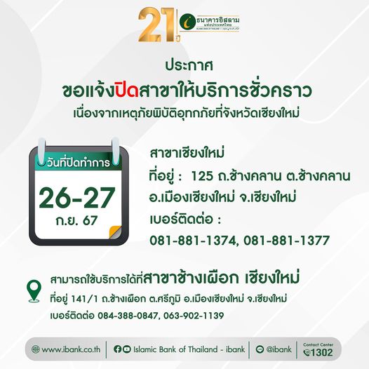 ธนาคารอิสลามแห่งประเทศไทย แจ้งปิดสาขาให้บริการชั่วคราว วันที่ 26 – 27 กันยายน 2567 เนื่องจากเหตุภัยพิบัติอุทกภัยที่จังหวัดเชียงใหม่ ส่งผลกระทบให้สาขาไม่สามารถเปิดให้บริการได้