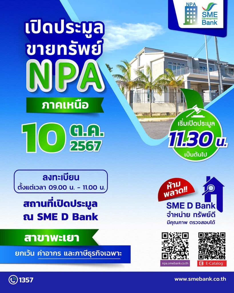 SME D Bank จัดงานประมูลขายทรัพย์ NPA ภาคเหนือ ในวันที่ 10 ตุลาคม 2567 ข่าวสารกิจกรรม SME D Bank จัดงานประมูลขายทรัพย์ NPA ภาคเหนือ ในวันที่ 10 ตุลาคม 2567 ธนาคารพัฒนาวิสาหกิจขนาดกลางและขนาดย่อมแห่งประเทศไทย จัดงานประมูลขายทรัพย์ NPA ภาคเหนือ ในวันพฤหัสบดีที่ 10 ตุลาคม 2567 ลงทะเบียน ตั้งแต่เวลา 09.00 – 11.00 น. ณ SME Bank ณ สาขาพะเยา เริ่มเปิดประมูล เวลา 11.30 น. เป็นต้นไป หมายเหตุ : ยกเว้น ค่าอากร และภาษีธุรกิจเฉพาะ ที่มา : https://citly.me/Th2s3 Post Views: 9 FacebookFacebookXTwitterLINELine