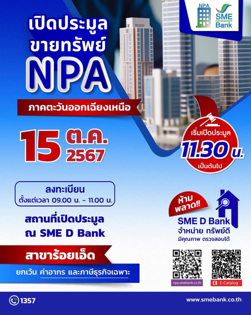 SME D Bank จัดงานประมูลขายทรัพย์ NPA ภาคอีสาน ในวันที่ 15 ตุลาคม 2567 ข่าวสารกิจกรรม SME D Bank จัดงานประมูลขายทรัพย์ NPA ภาคอีสาน ในวันที่ 15 ตุลาคม 2567 ธนาคารพัฒนาวิสาหกิจขนาดกลางและขนาดย่อมแห่งประเทศไทย จัดงานประมูลขายทรัพย์ NPA ภาคอีสาน ในวันพฤหัสบดีที่ 15 ตุลาคม 2567 ลงทะเบียน ตั้งแต่เวลา 09.00 – 11.00 น. ณ SME Bank ณ สาขาร้อยเอ็ด เริ่มเปิดประมูล เวลา 11.30 น. เป็นต้นไป หมายเหตุ : ยกเว้น ค่าอากร และภาษีธุรกิจเฉพาะ ที่มา : https://citly.me/sgDm2 Post Views: 6 FacebookFacebookXTwitterLINELine