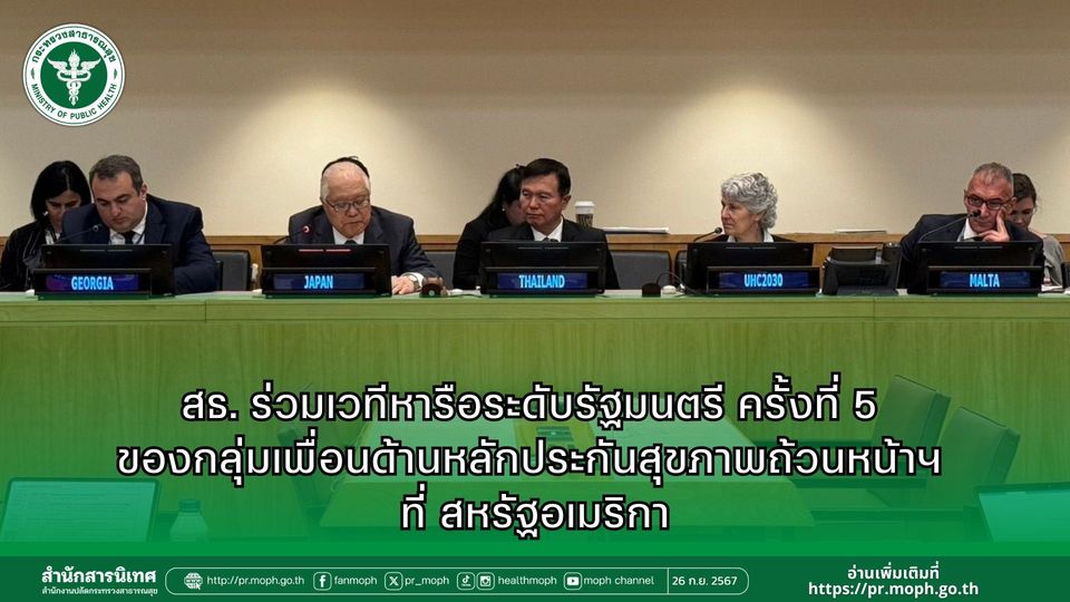 รองปลัดกระทรวงสาธารณสุข ร่วมประชุมระดับรัฐมนตรี ครั้งที่ 5 ของกลุ่มเพื่อนด้านหลักประกันสุขภาพถ้วนหน้าและสุขภาพทั่วโลก ผลักดันการบรรลุเป้าหมายการสร้างหลักประกันสุขภาพถ้วนหน้า ภายในปี ค.ศ. 2030 เน้นป้องกันความเสี่ยงทางการเงินของประชาชนในการเข้าถึงบริการสุขภาพถ้วนหน้า และการจัดการปัญหาการดื้อยาต้านจุลชีพ