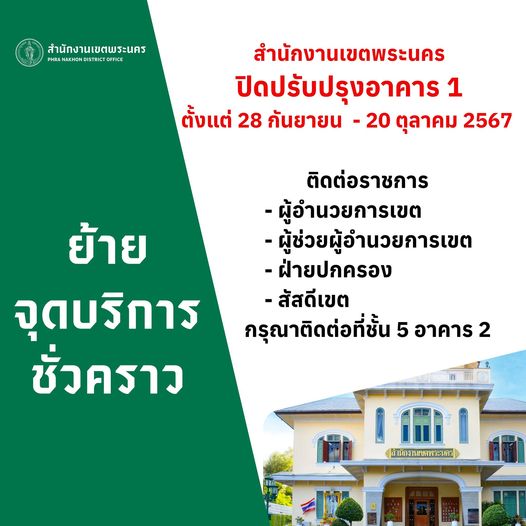 สำนักงานเขตพระนคร ปิดปรับปรุงอาคาร 1 ตั้งแต่วันที่ 28 กันยายน – 20 ตุลาคม 2567 โดยย้ายสำนักงานและจุดบริการไปที่ ชั้น 5 อาคาร 2