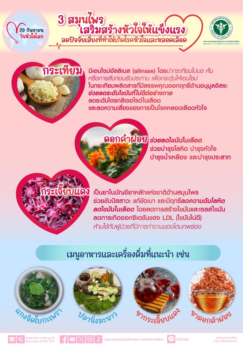 กรมการแพทย์แผนไทยและการแพทย์ทางเลือก ขอแนะนำ 3 สมุนไพรไทย ที่ช่วยยับยั้งการเกิดโรคหัวใจและหลอดเลือด ได้แก่ 1)กระเทียม ในกระเทียมมีเอนไซม์อัลลิเนส (allinase) โดยการนำกระเทียมไปบด หั่น หรือการสับ ก่อนรับประทานเพื่อกระตุ้นให้เอนไซม์ในกระเทียมผลิตสารที่มีสรรพคุณออกฤทธิ์ต้านอนุมูลอิสระ ช่วยลดระดับไขมันที่ไม่ดีต่อร่างกาย ลดระดับไตรกลีเซอไรด์ในเลือดและลดความเสี่ยงของการเป็นโรคหลอดเลือดหัวใจ 2)ดอกคำฝอย สรรพคุณ ช่วยลดไขมันในเลือด ช่วยบำรุงโลหิต บำรุงหัวใจ บำรุงน้ำเหลือง และ บำรุงประสาท 3)กระเจี๊ยบแดง เป็นยาในบัญชียาหลักแห่งชาติด้านสมุนไพร สรรพคุณ ขับปัสสาวะ แก้ขัดเบา และมีฤทธิ์ลดความดันโลหิต ลดไขมันในเลือด โดยลดการสร้างไขมันและเซลล์ไขมัน ลดการเกิดออกซิเดชันของ LDL (ไขมันไม่ดี) สำหรับ กระเจี๊ยบแดง มีข้อห้ามใช้กับผู้ป่วยที่มีการทำงานของไตบกพร่อง