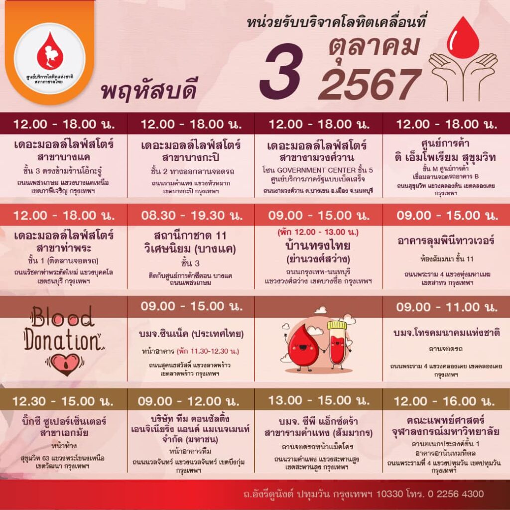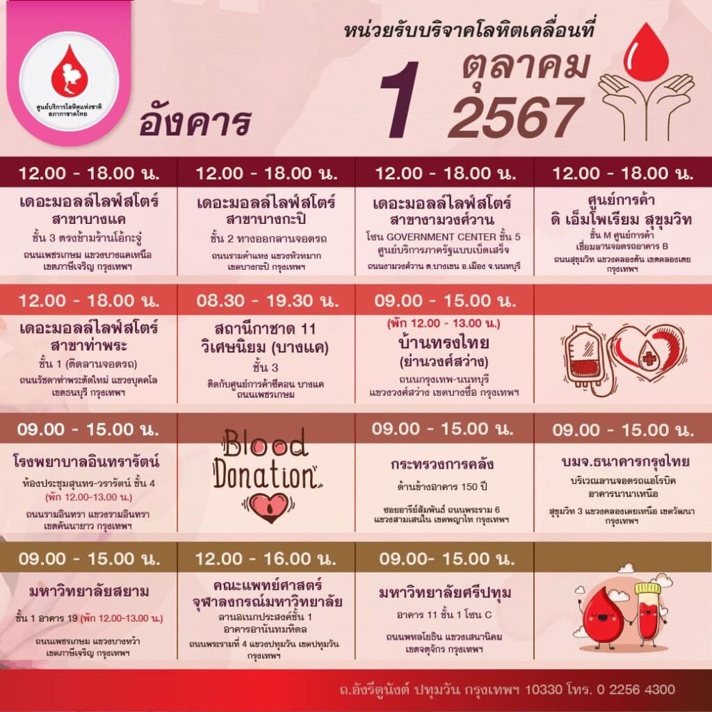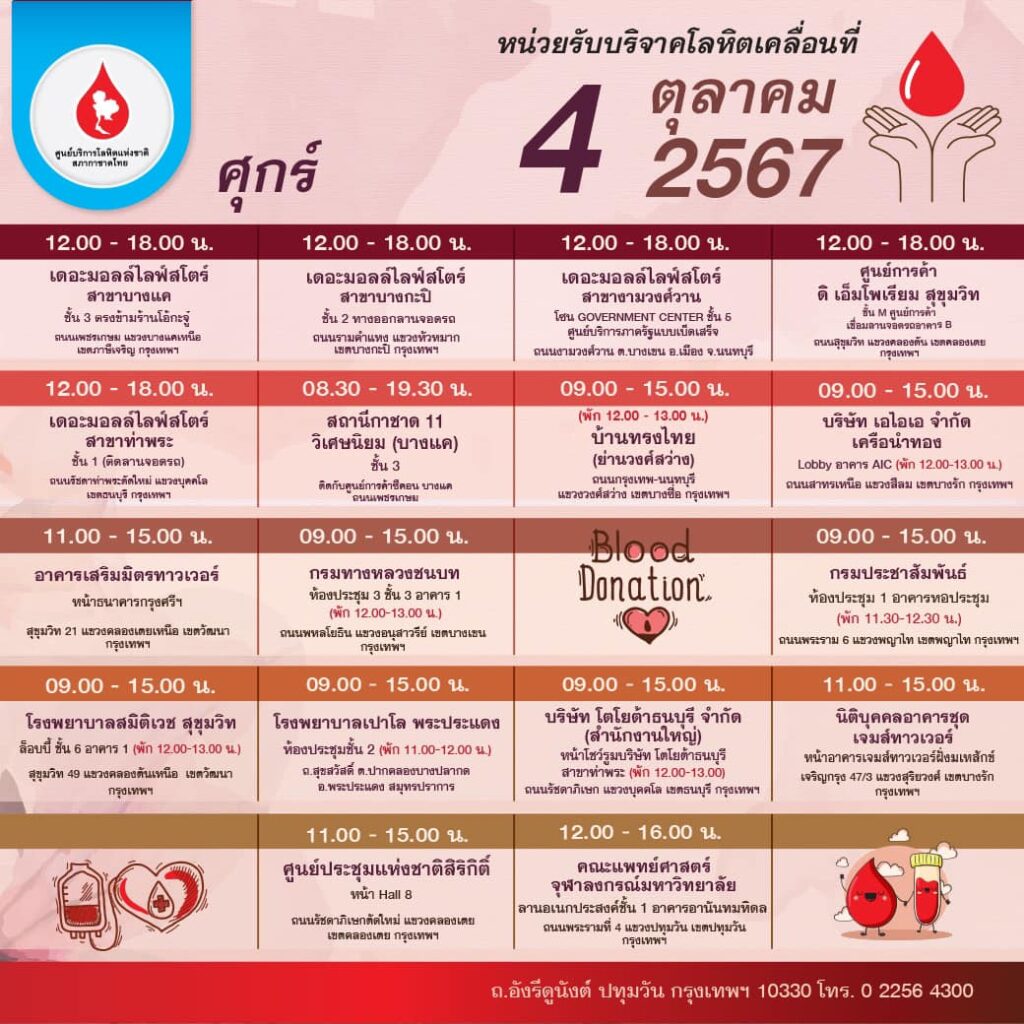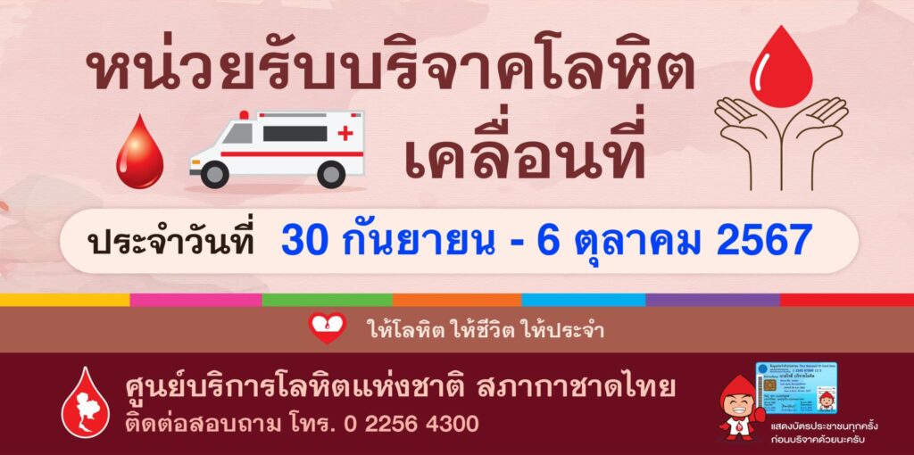 สภากาชาดไทย ออกหน่วยรับบริจาคโลหิตเคลื่อนที่ วันที่ 30 กันยายน – 6 ตุลาคม 2567