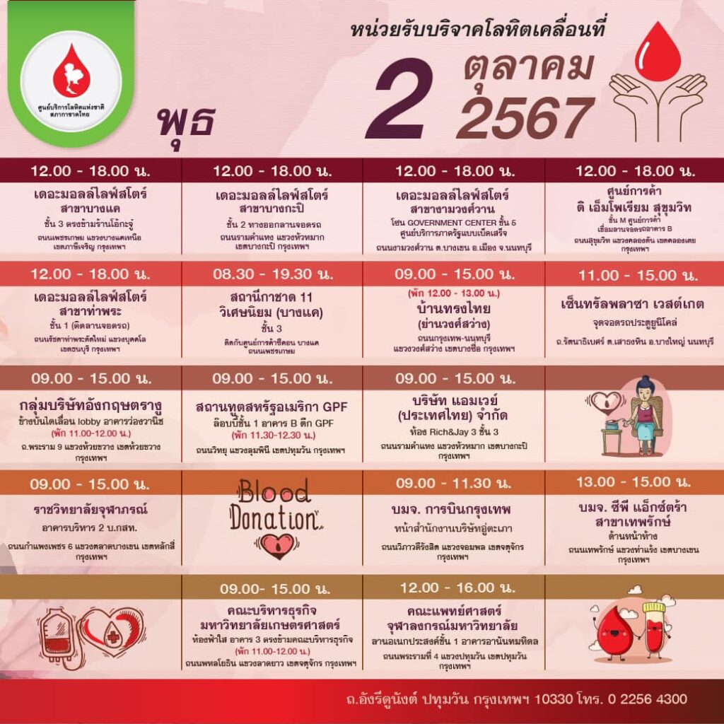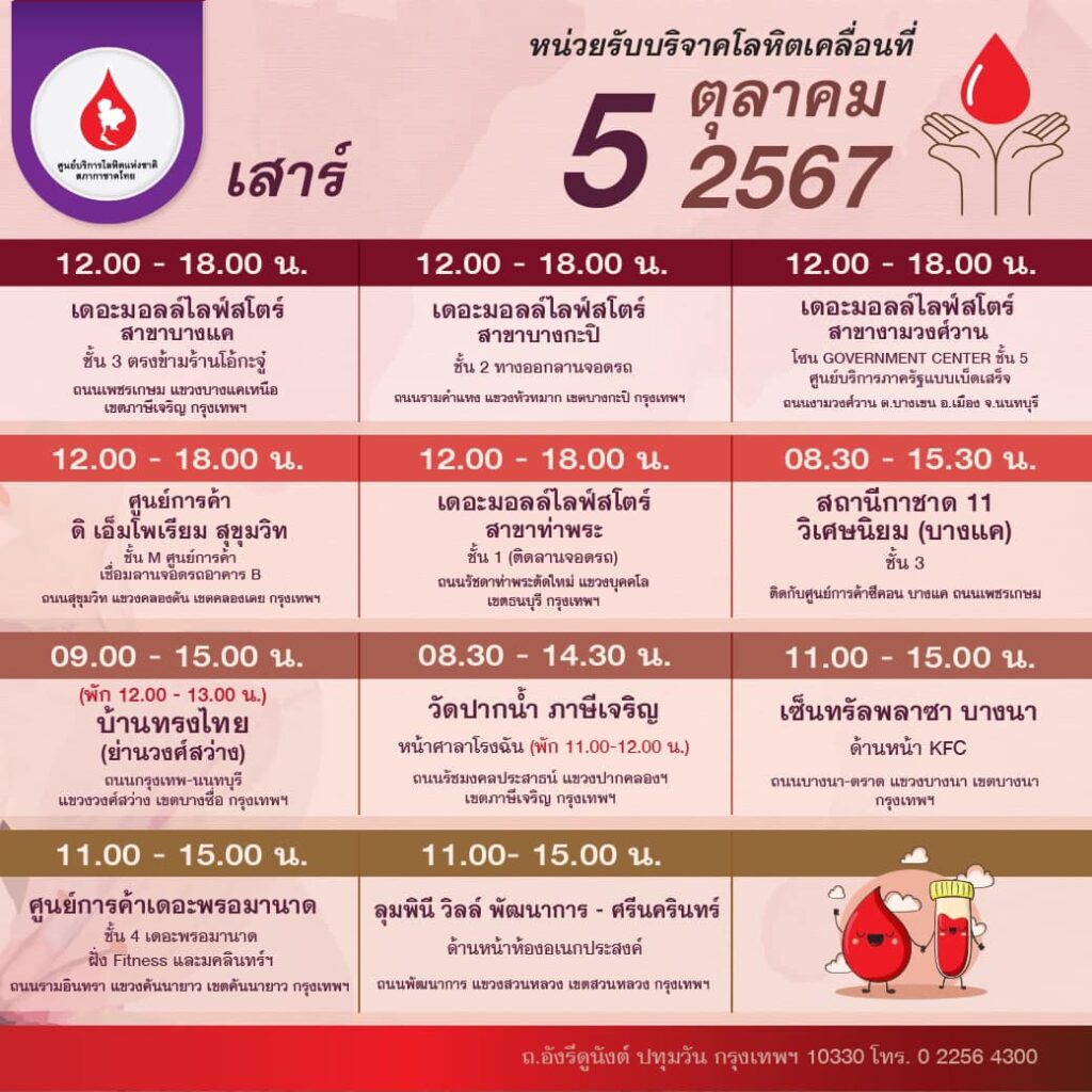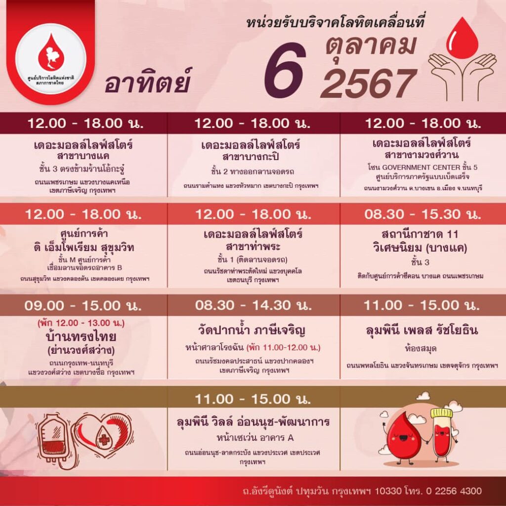 สภากาชาดไทย ออกหน่วยรับบริจาคโลหิตเคลื่อนที่ วันที่ 30 กันยายน – 6 ตุลาคม 2567