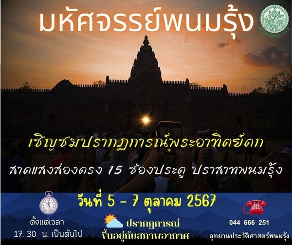อุทยานประวัติศาสตร์พนมรุ้ง เชิญชมปรากฏการณ์พระอาทิตย์ตกตรง 15 ช่องประตู วันที่ 5 – 7 ตุลาคม 2567 เวลา 17.30 น. เป็นต้นไป ณ บริเวณลานหน้าโคปุระ ทิศตะวันออก ณ ปราสาทพนมรุ้ง อำเภอเฉลิมพระเกียรติ จังหวัดบุรีรัมย์ พระอาทิตย์จะตกประมาณ 17.55 น.