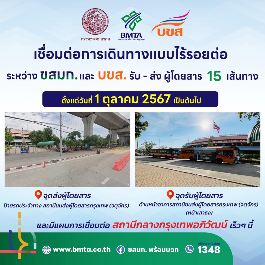 ขสมก. ร่วมมือกับ บขส. เชื่อมต่อการเดินทางแบบไร้รอยต่อ รับส่งผู้โดยสาร 15 เส้นทาง เริ่มตั้งแต่วันที่ 1 ต.ค. 67