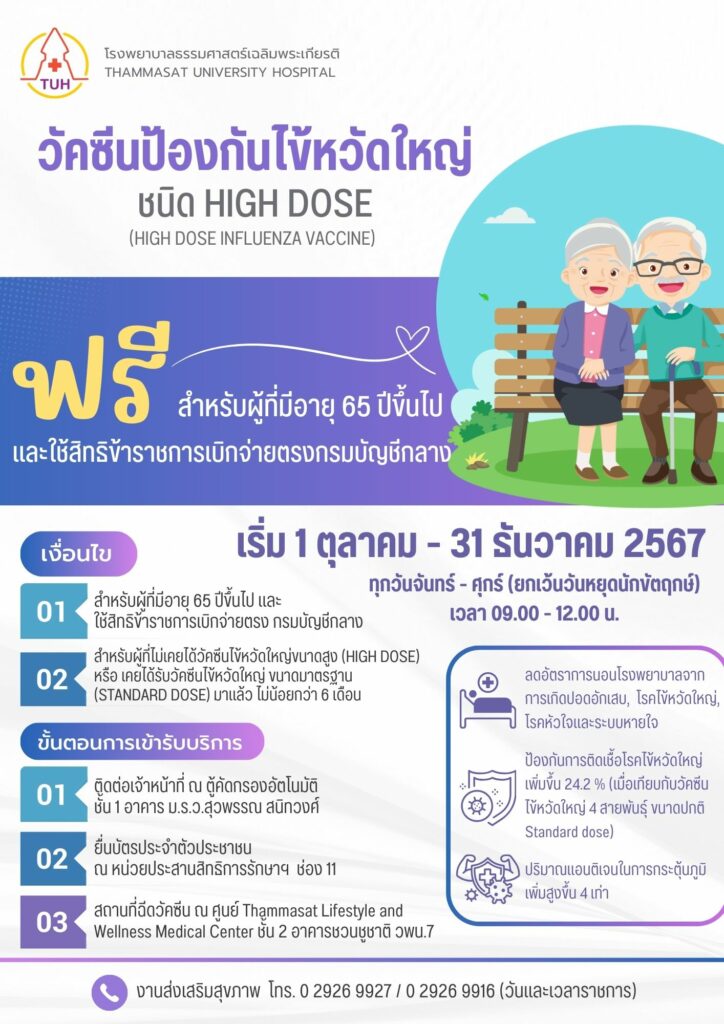 โรงพยาบาลธรรมศาสตร์เฉลิมพระเกียรติ เปิดให้วัคซีนป้องกันไข้หวัดใหญ่ ชนิด High dose (High dose Influenza VACCINE) สำหรับผู้ที่มีอายุ 65 ปีขึ้นไป และใช้สิทธิข้าราชการเบิกจ่ายตรงกรมบัญชีกลาง ฟรี เริ่มวันที่ 1 ตุลาคม – 31 ธันวาคม 2567