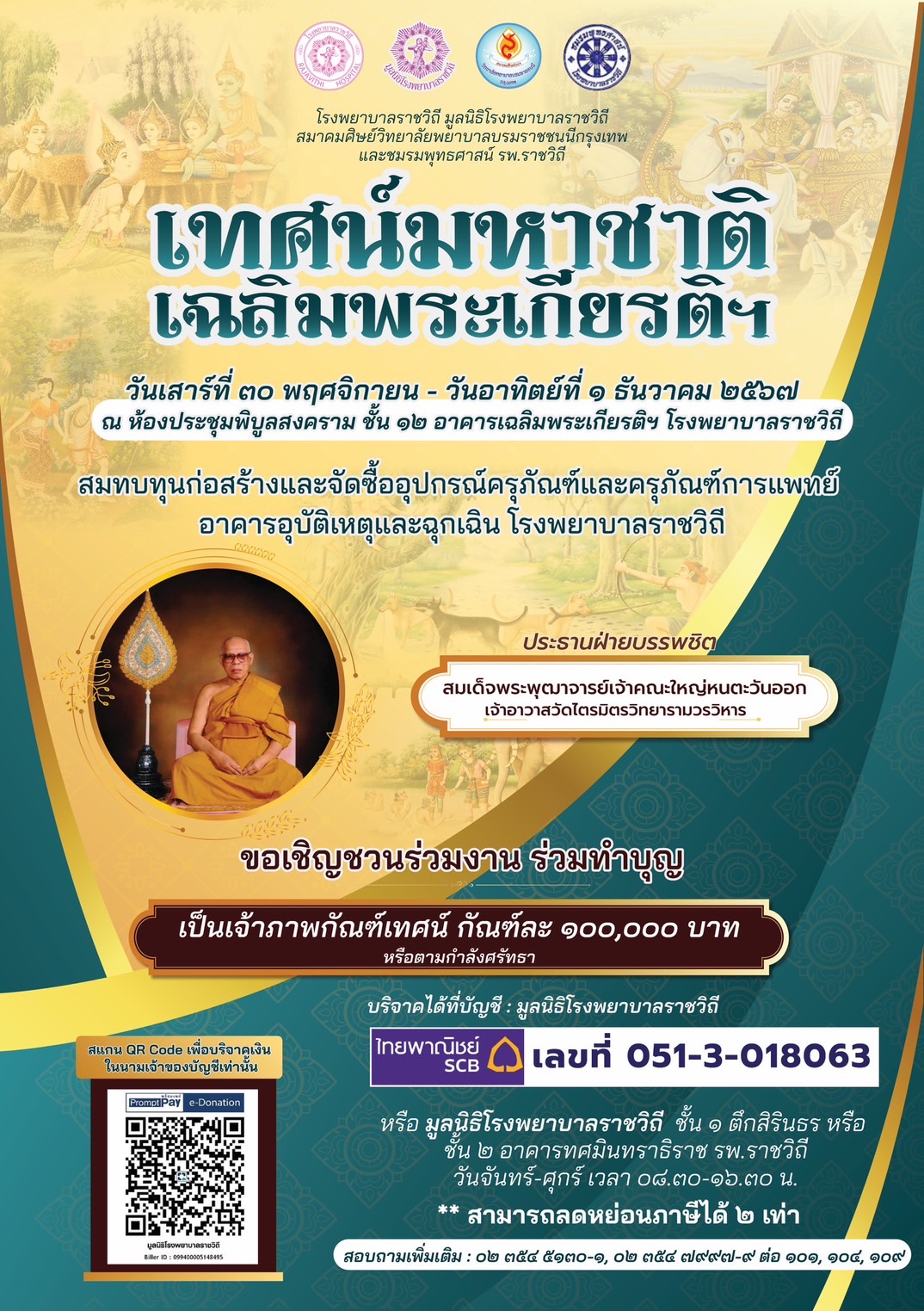 โรงพยาบาลราชวิถี ร่วมกับ มูลนิธิโรงพยาบาลราชวิถี สมาคมศิษย์วิทยาลัยพยาบาลบรมราชชนนี กรุงเทพ และชมรมพุทธศาสน์ โรงพยาบาลราชวิถี ขอเรียนเชิญพุทธศาสนิกชนร่วมสร้างบุญใหญ่ในงาน “เทศน์มหาชาติ” 13 กัณฑ์ 1,000 พระคาถา เฉลิมพระเกียรติพระบาทสมเด็จพระเจ้าอยู่หัว ในโอกาสมหามงคลเฉลิมพระชนมพรรษา 6 รอบ 72 พรรษา ในวันเสาร์ที่ 30 พฤศจิกายน – วันอาทิตย์ที่ 1 ธันวาคม 2567 ณ ห้องประชุมพิบูลสงคราม ชั้น 12 อาคารเฉลิมพระเกียรติฯ โรงพยาบาลราชวิถี เพื่อจัดหาทุนสนับสนุนในการจัดซื้ออุปกรณ์ ครุภัณฑ์ และครุภัณฑ์การแพทย์ อาคารอุบัติเหตุและฉุกเฉิน โรงพยาบาลราชวิถี เพื่อเพิ่มโอกาสในการรอดชีวิตของผู้ป่วยฉุกเฉินได้มากขึ้น โดยอาคารอุบัติเหตุและฉุกเฉิน โรงพยาบาลราชวิถี จะพร้อมเปิดใช้งานได้อย่างสมบูรณ์ ในวันที่ 1 ธันวาคม 2568